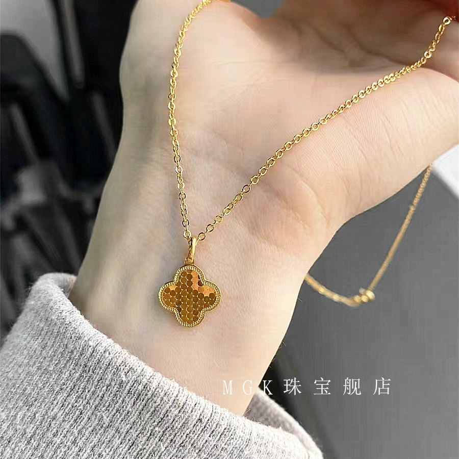 镭射四叶草吊坠项链女纯银镀18K黄金 潮鱼鳞花朵锁骨链简约送女友