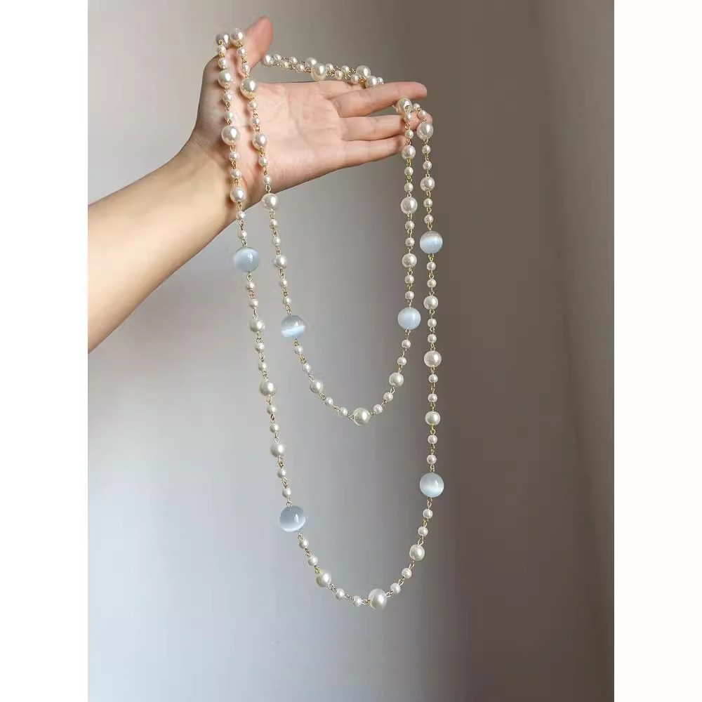 新长款仿珍珠猫眼石多层项链女百搭时尚颈链轻奢小众高级感毛衣链