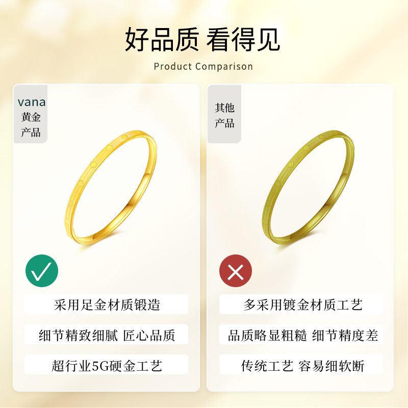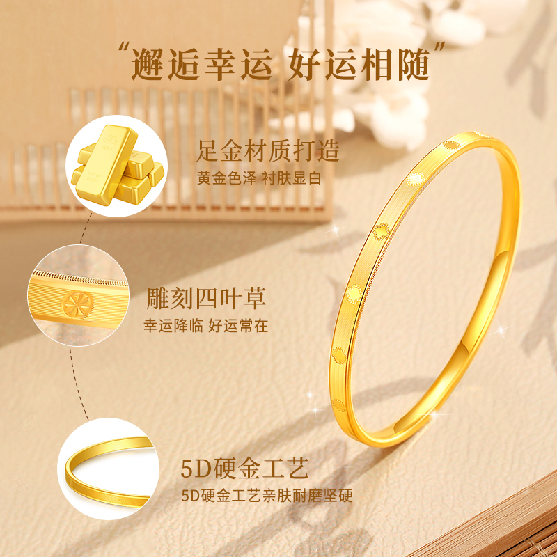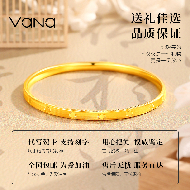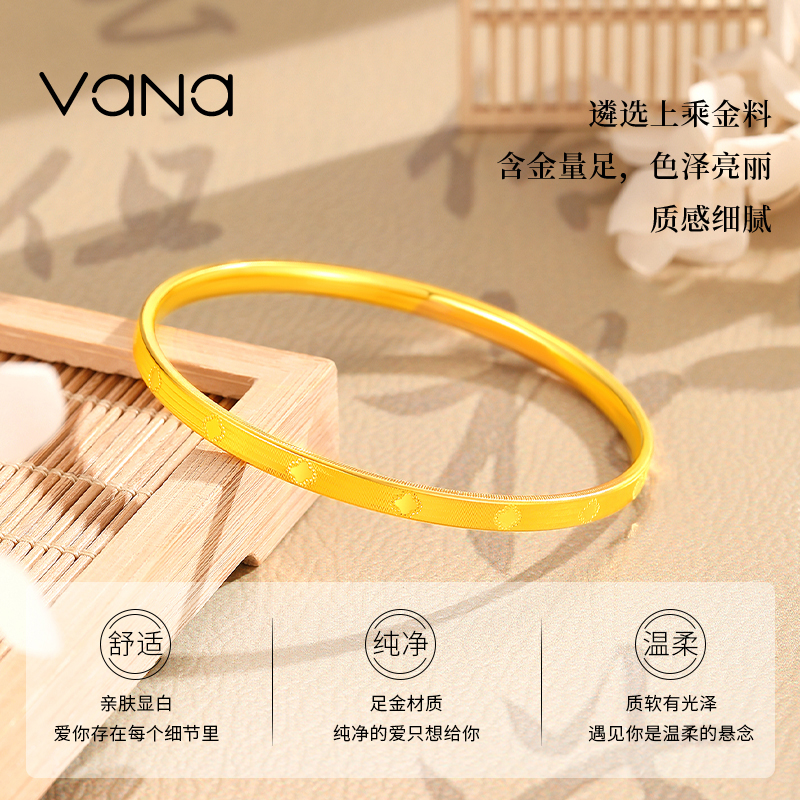 vana足金幸运四叶草黄金手镯女纯金镯子素圈手饰生日礼物送女友