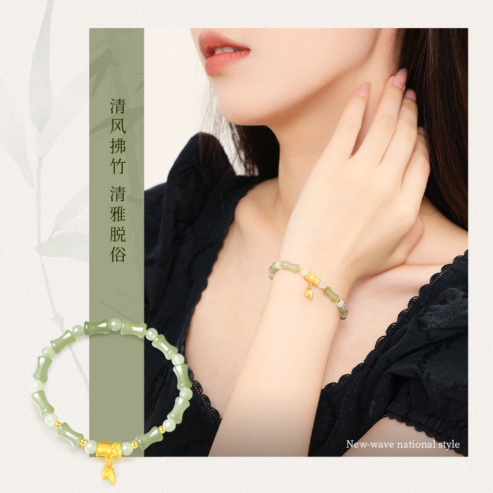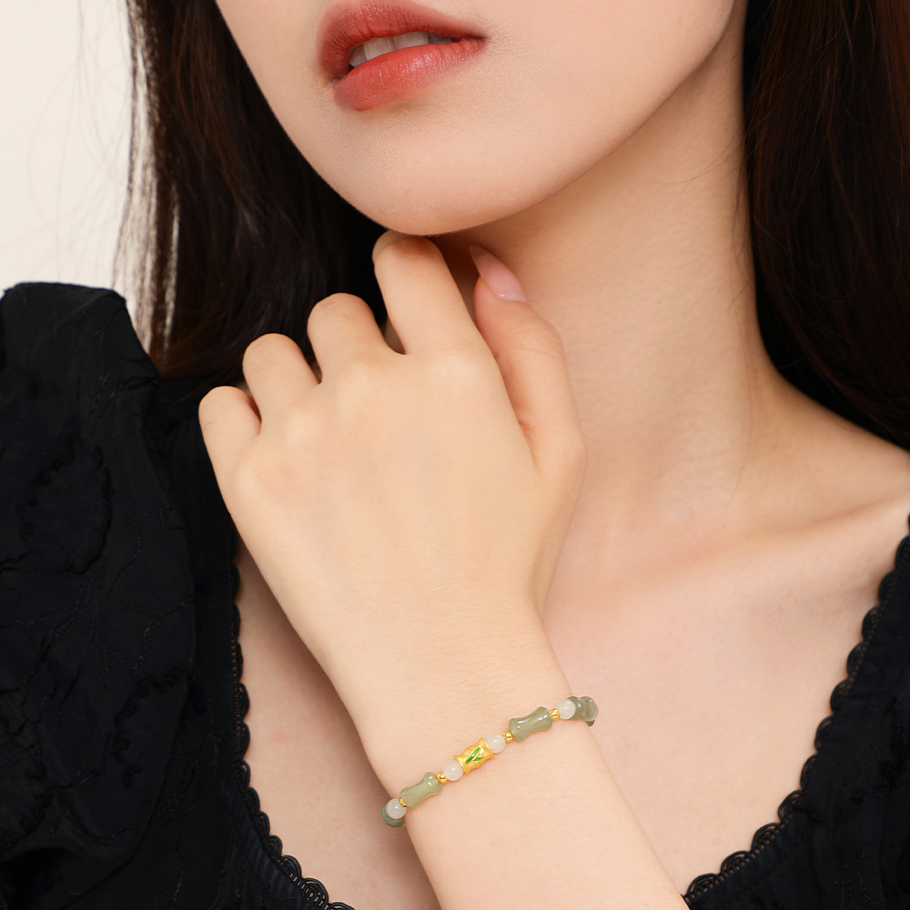 周大生黄金镶玉手串女足金和田玉珠子竹节珐琅手链送女友生日礼物