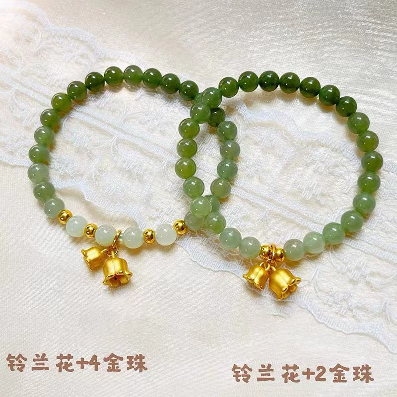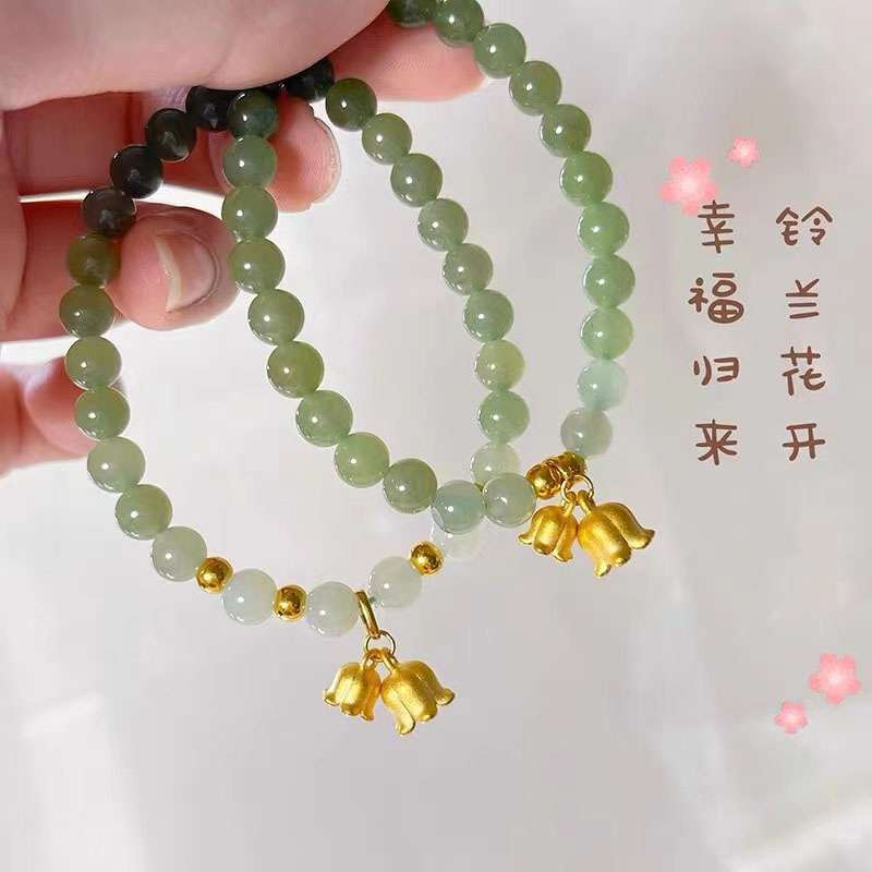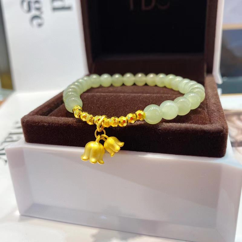999足金铃兰花手链女黄金碎金子和田玉金珠花朵手串七夕送礼新款