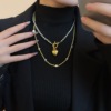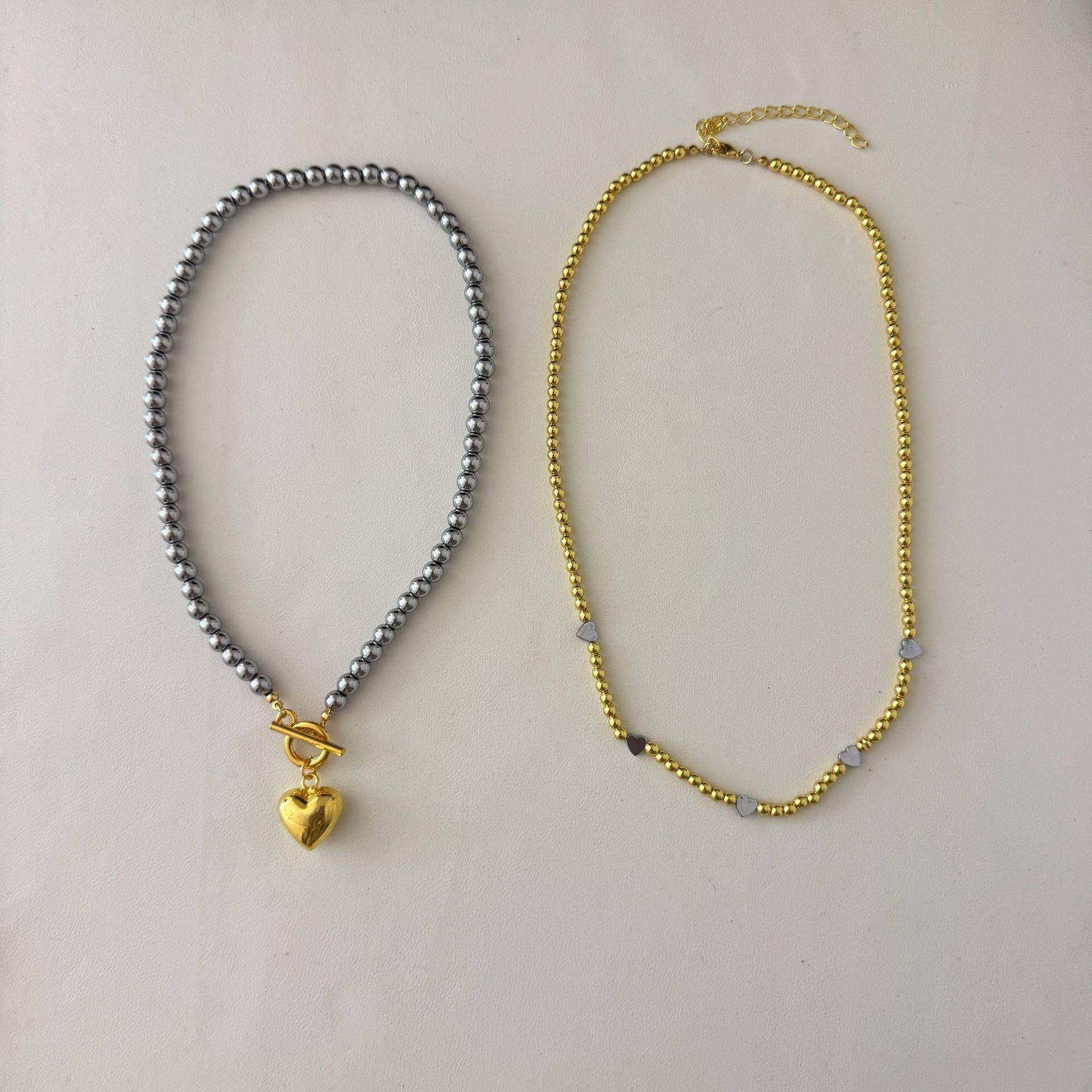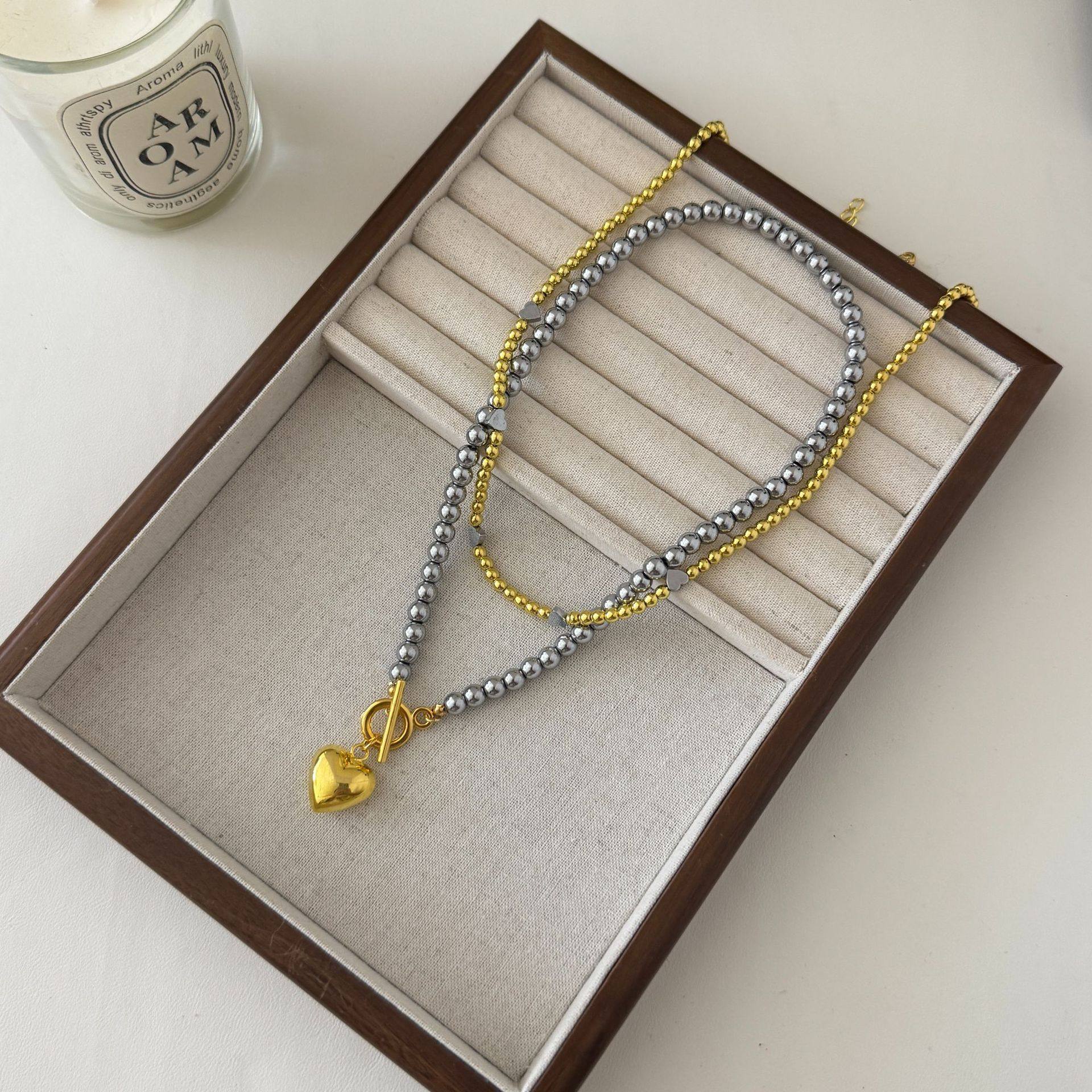 复古文艺风灰色金属珍珠叠戴爱心项链女轻奢高级感双层可拆毛衣链