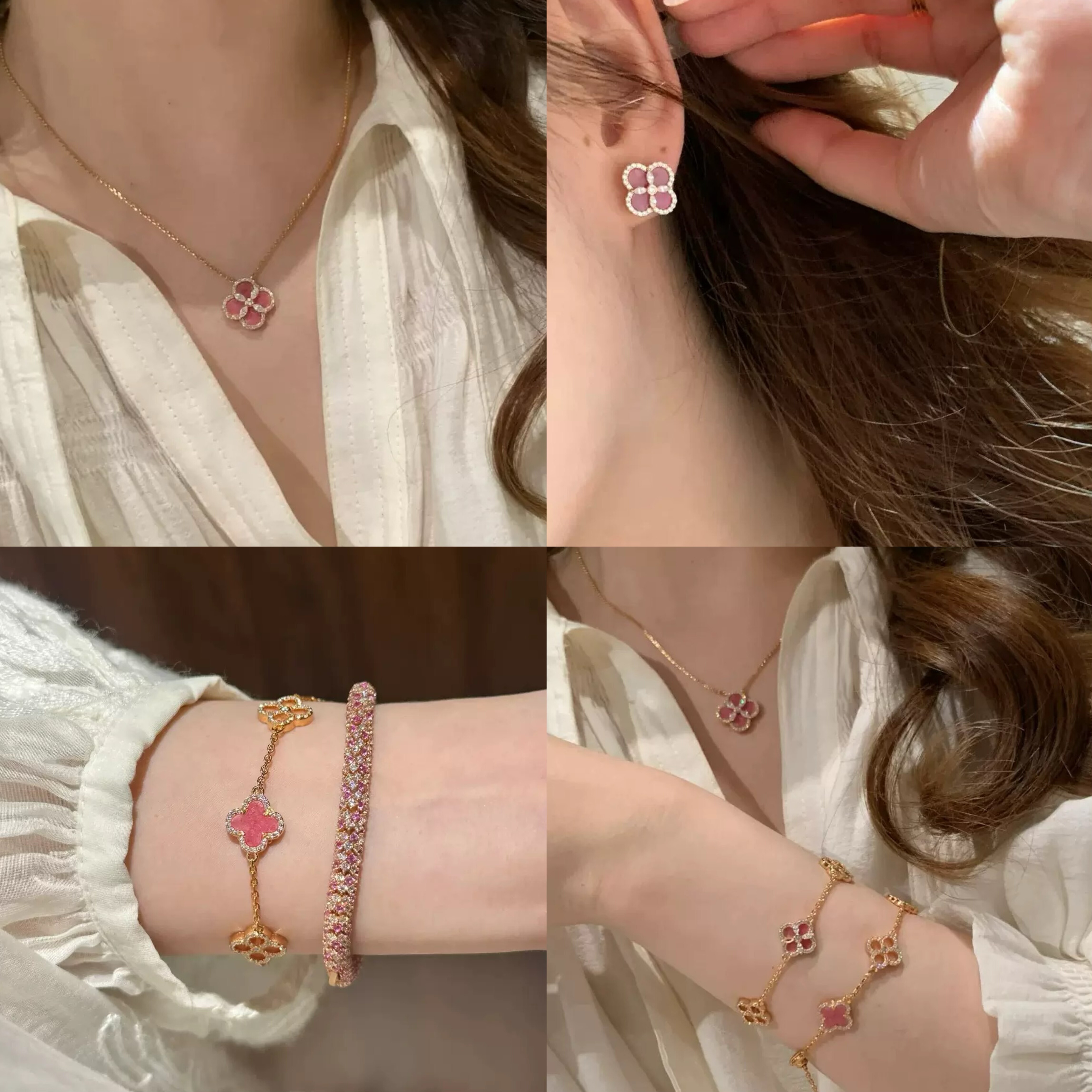 双面镶钻蔷薇粉玫瑰金色四叶五花轻奢气质高级感手链项链耳环大牌