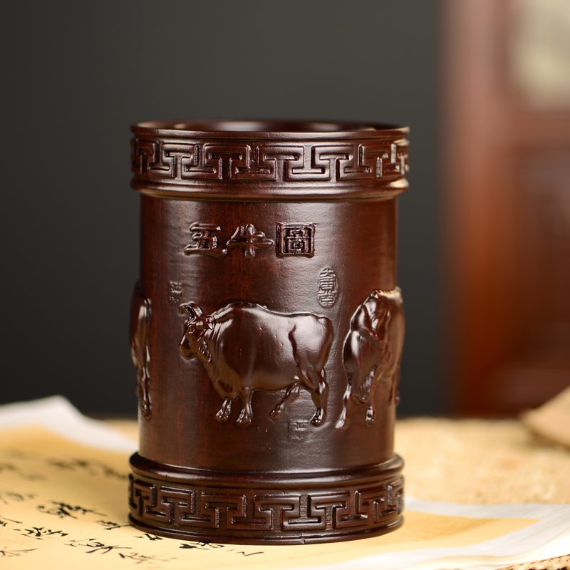 黑檀木雕五牛图笔筒工艺品办公室书桌家居客厅木质笔筒摆件送礼