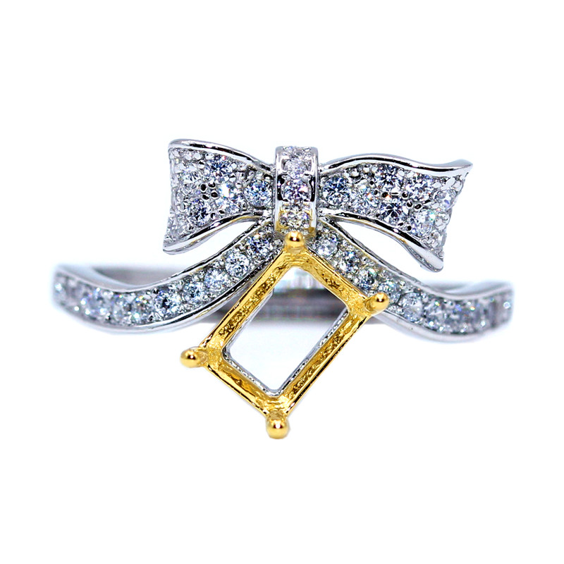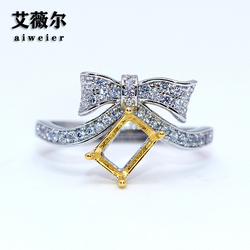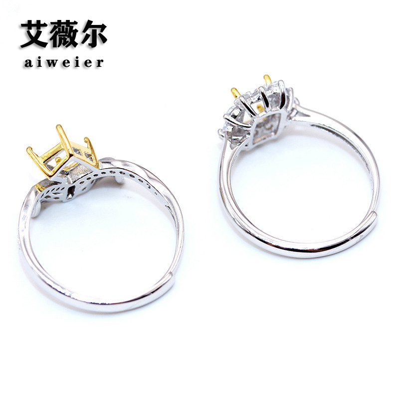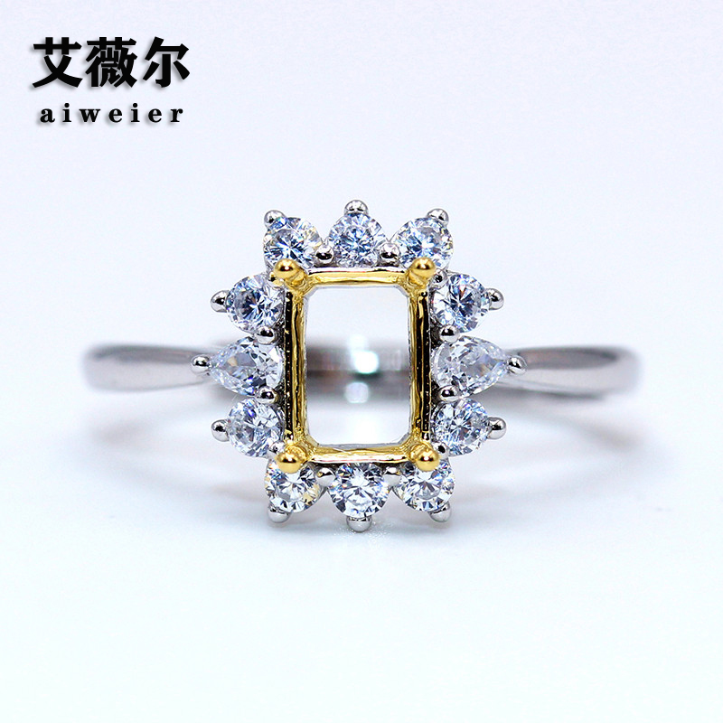 精工925纯银戒指空托长方形加工镶嵌双色戒托宝石定制18K金5*7mm