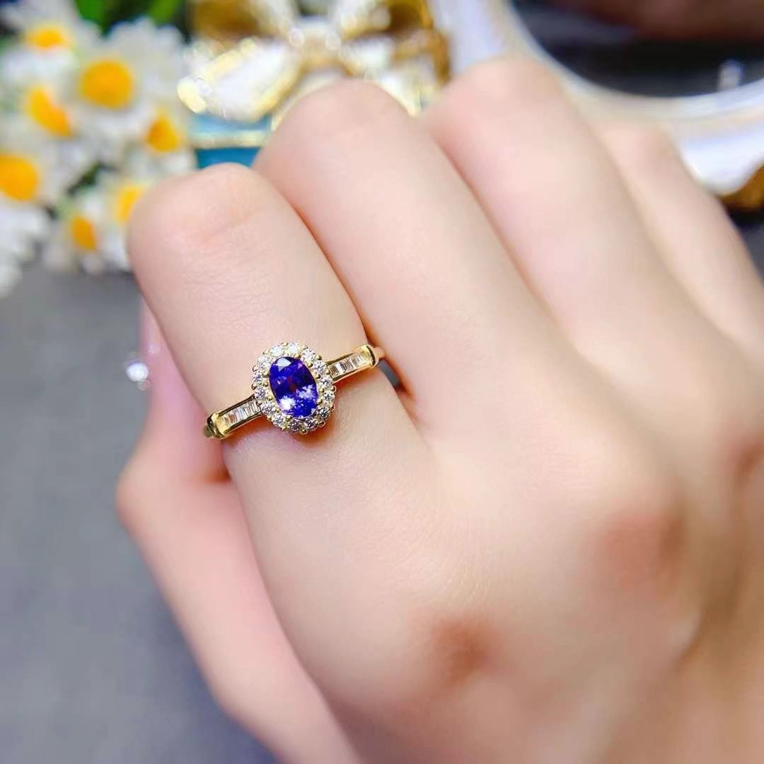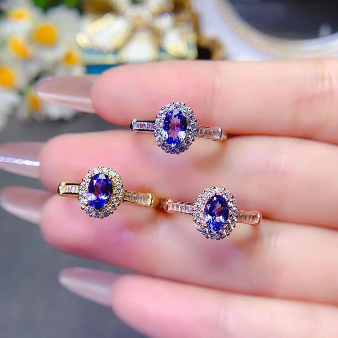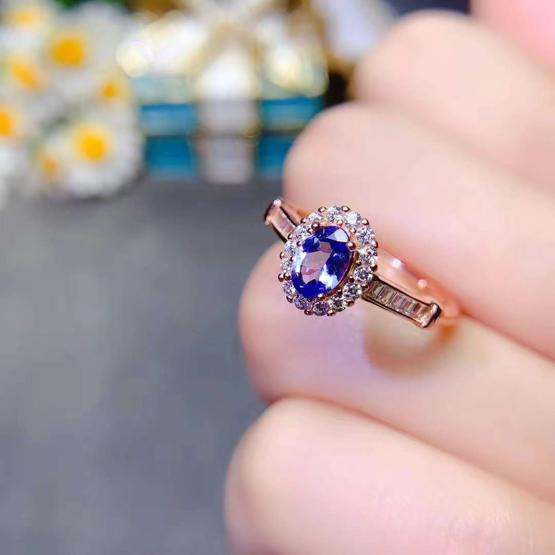 天然坦桑石戒指女戒子S925纯银镀金开口指环蓝色宝石欧美优雅时尚