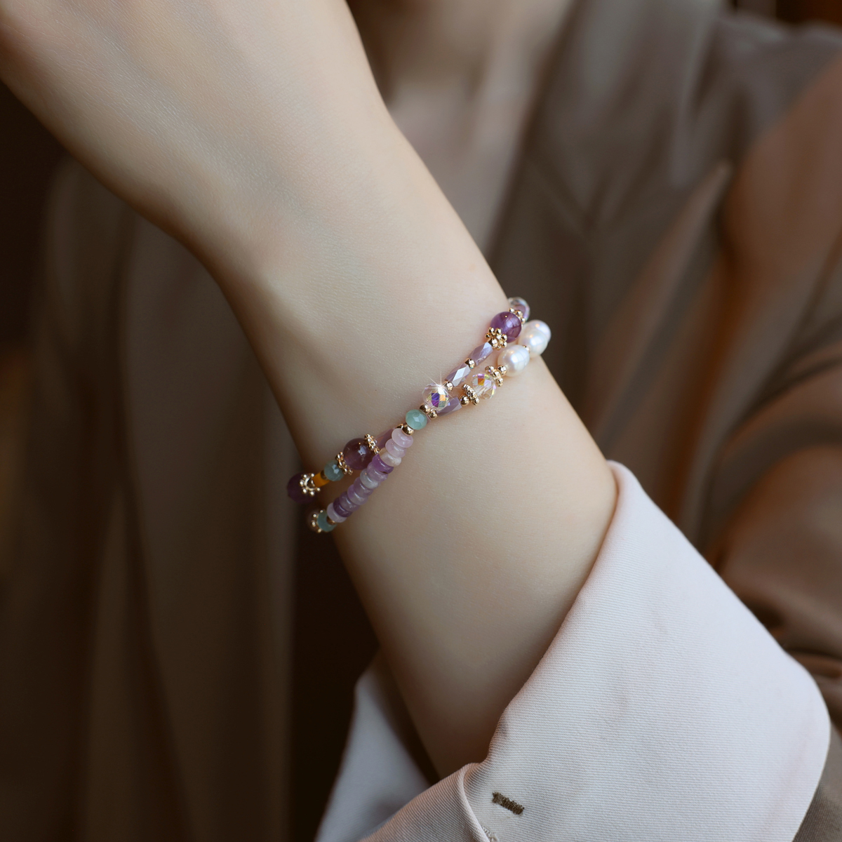 ZOXI国风新中式紫色天然石水晶手链轻奢小众旺财珍珠多圈手串手工