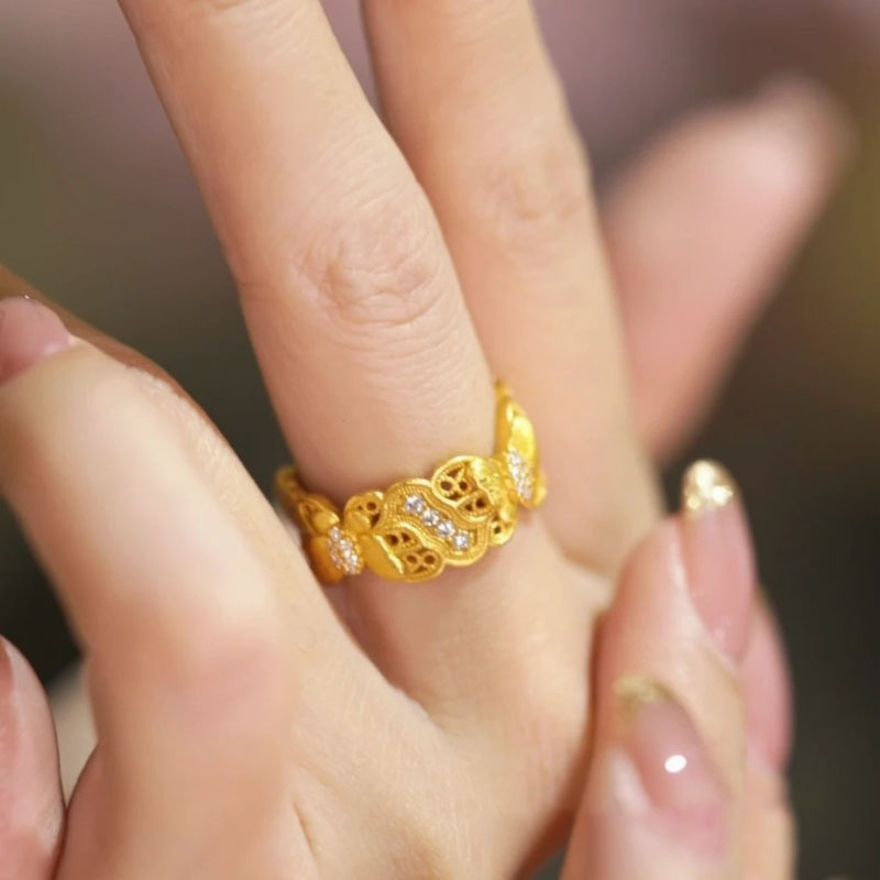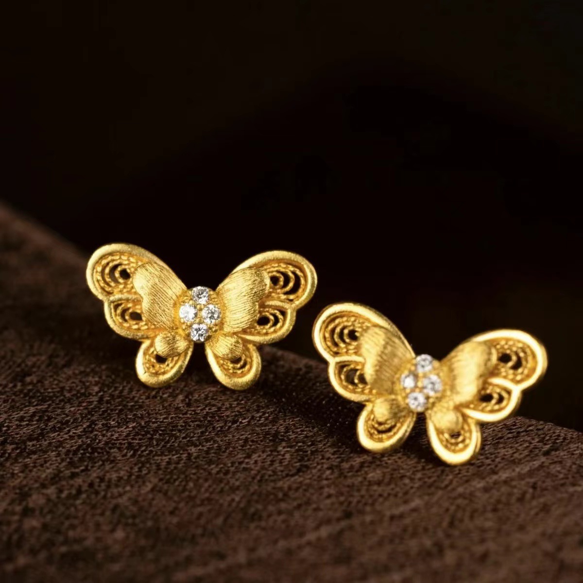 新中式高级感拉丝蝴蝶花纹戒指耳钉老钱风高保色真金电镀饰品套装