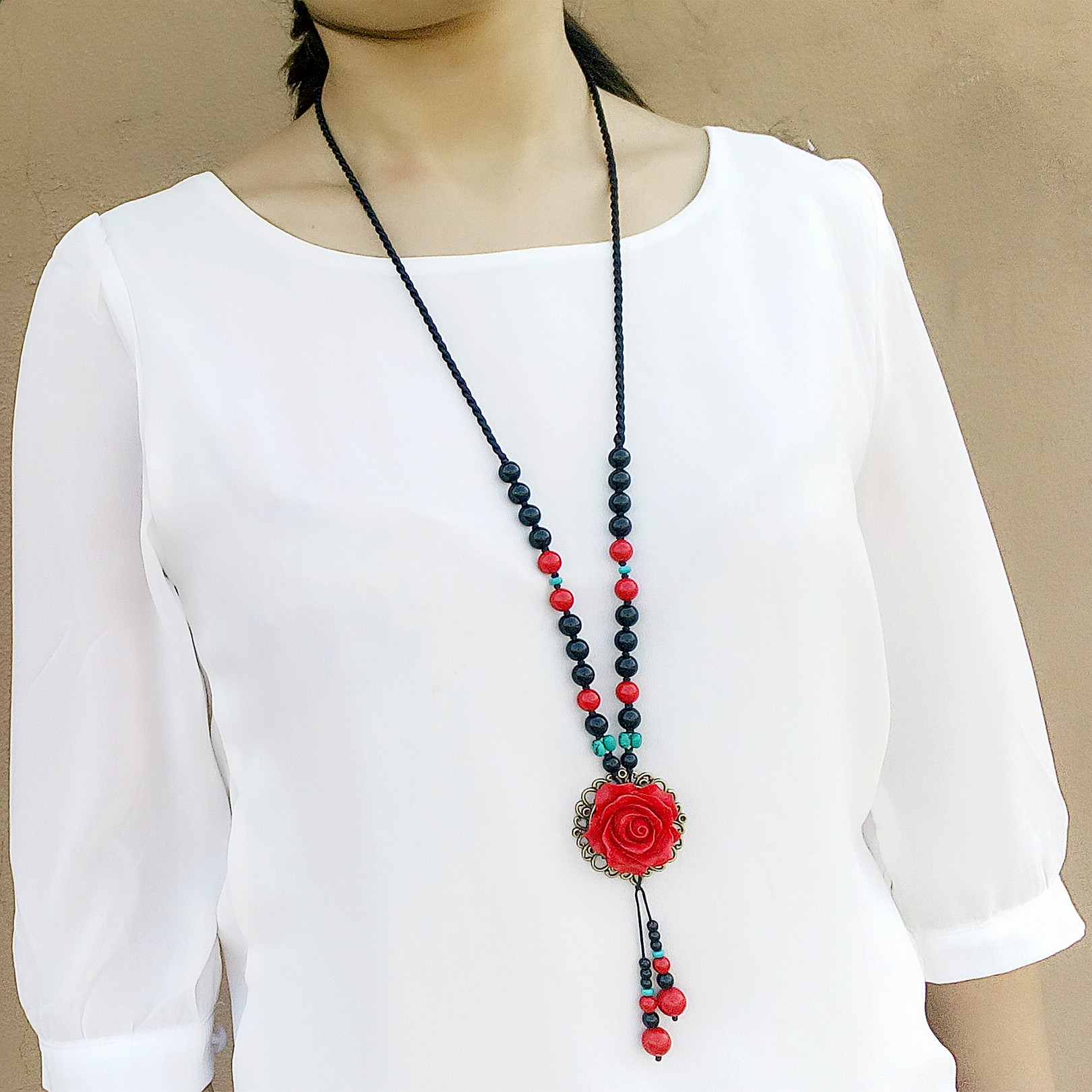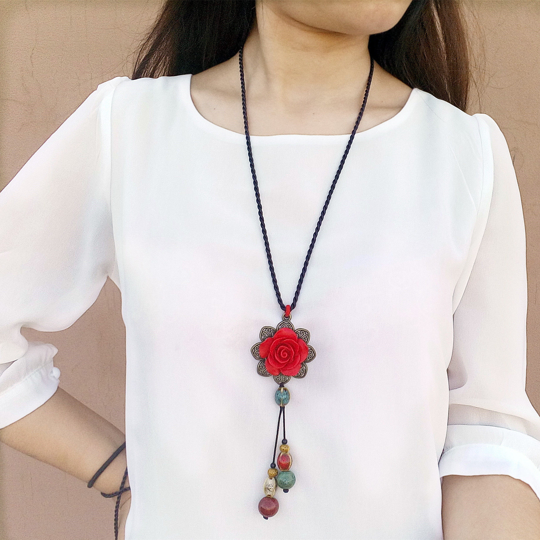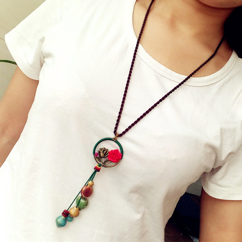 民族风花朵毛衣项链挂件红色新年喜庆简约吊坠汉服复古装配饰长款