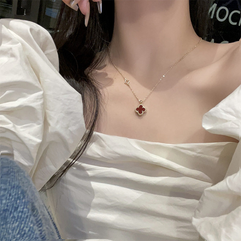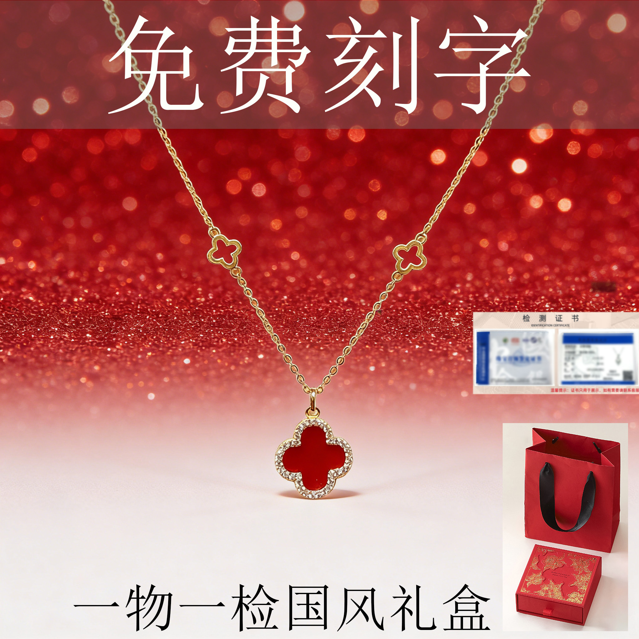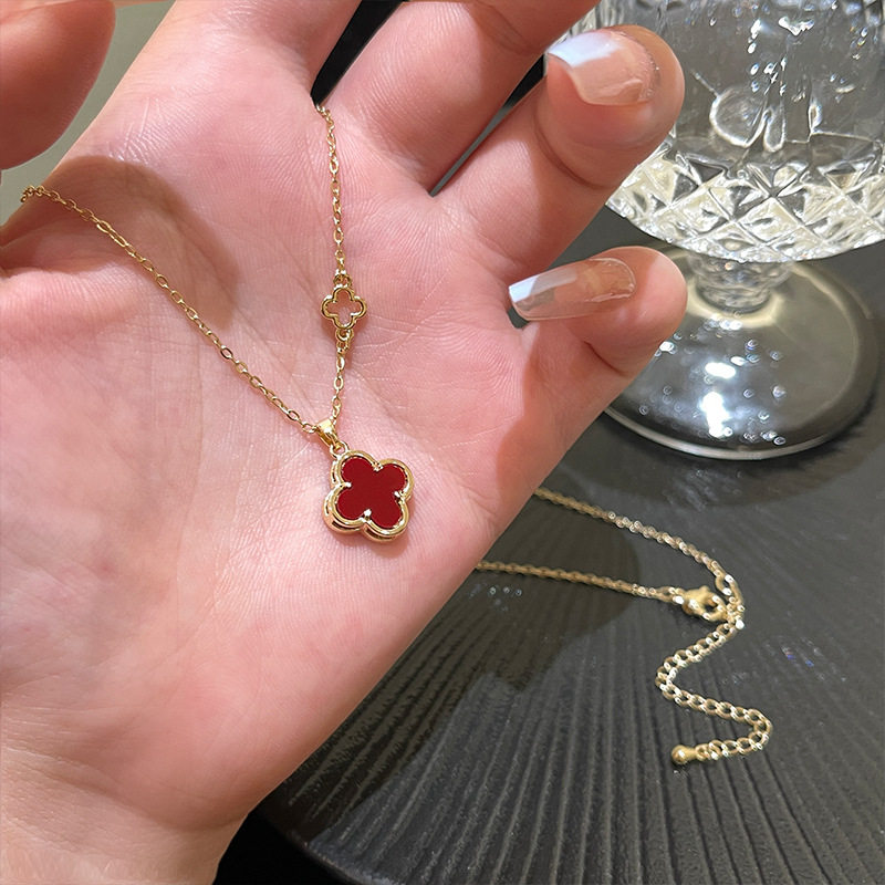 免费刻字S925锁骨链红色双面四叶项链女爆款设计师锁骨链小众颈