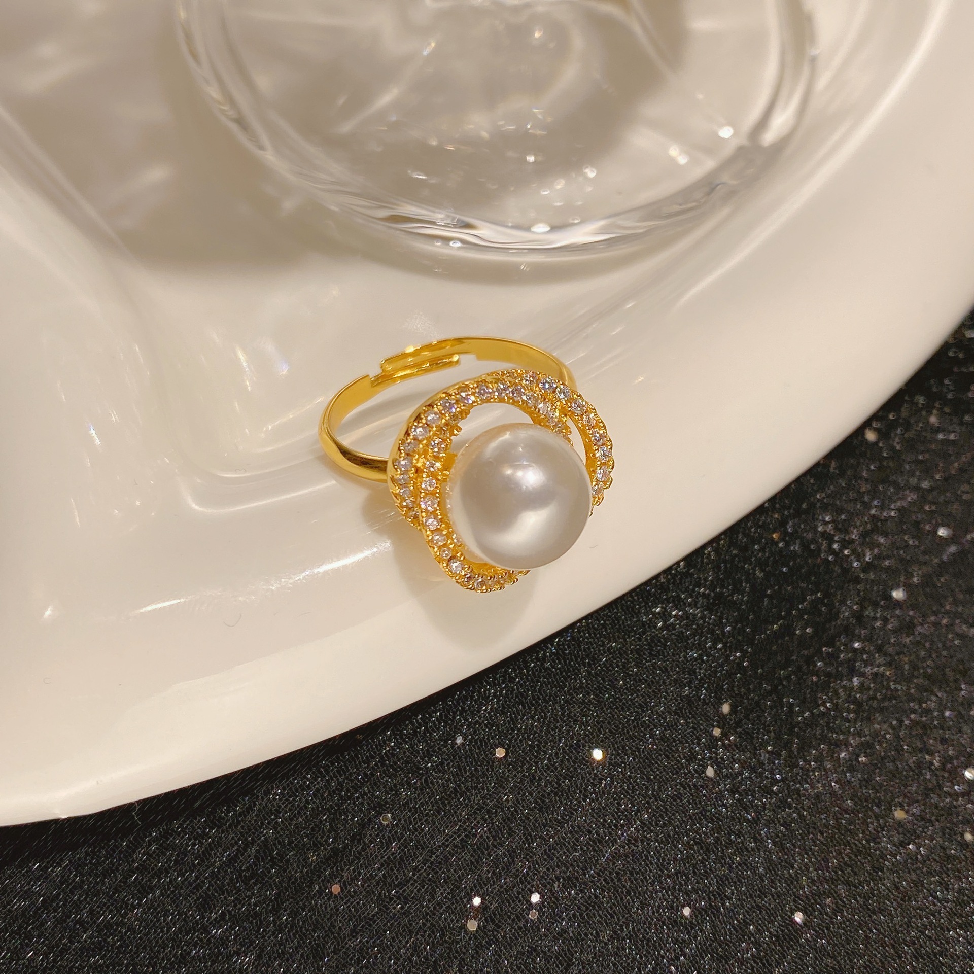韩版轻奢珍珠戒指女小众百搭镶嵌锆石开口指环网红流行设计感饰品