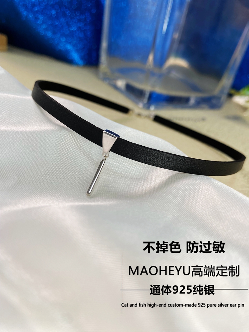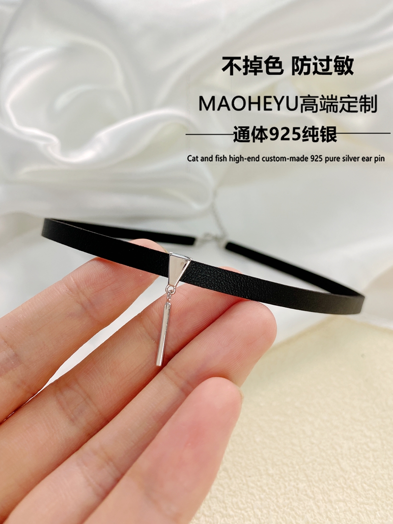 不掉色S925纯银黑色皮绳条形项圈choker锁骨链小众设计颈链简约潮