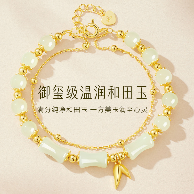 中国黄金央创和田玉手串竹节手链女款生士老婆生日礼物送女友S925