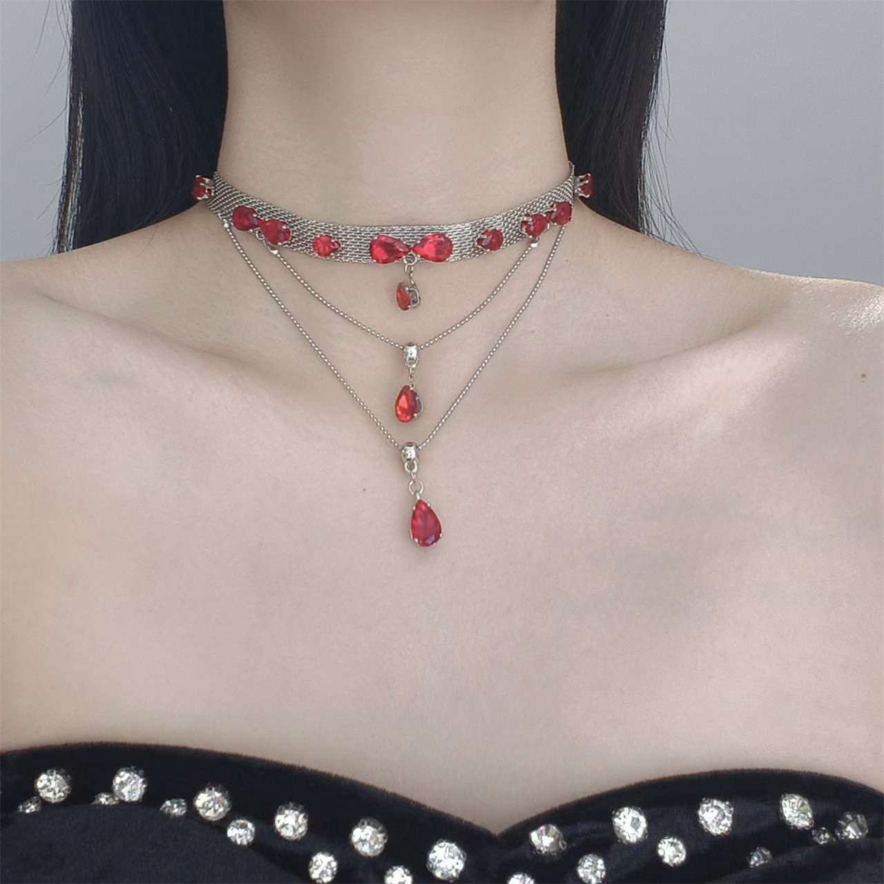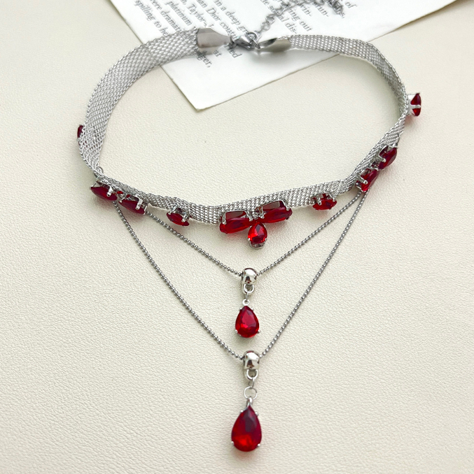 超闪红色吊坠满钻流苏项链多层叠戴气质高级感轻奢甜酷风choker32