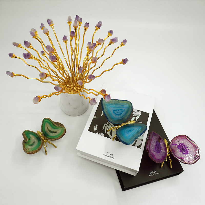 新中式彩色天然玛瑙蝴蝶黄铜水晶家居摆件饭桌墙面玄关轻奢软装饰