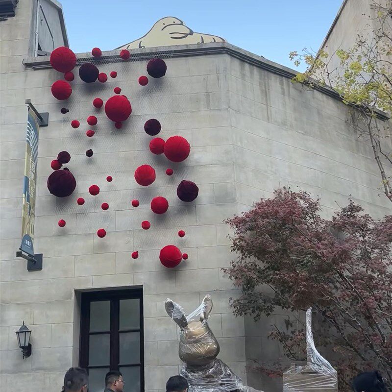 新年红色丝绒布毛线球打卡点布置美陈G列泡沫婚礼布景橱窗装饰道
