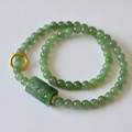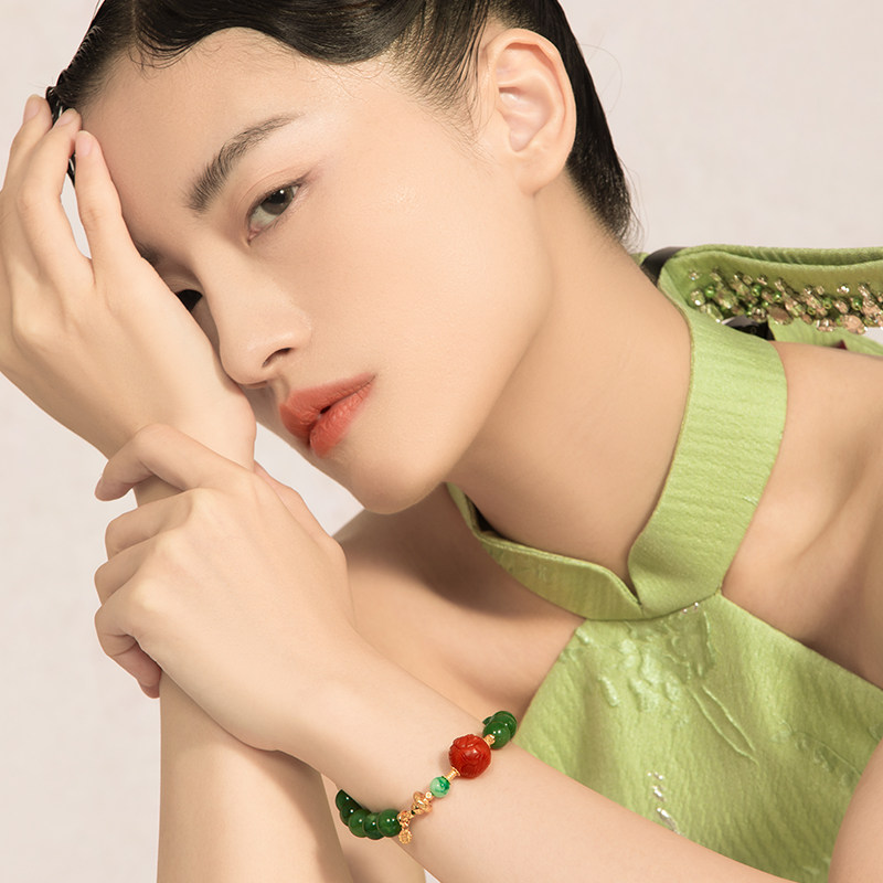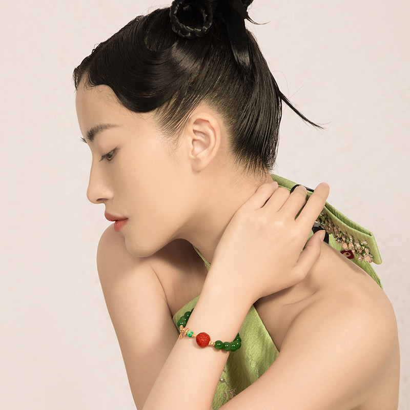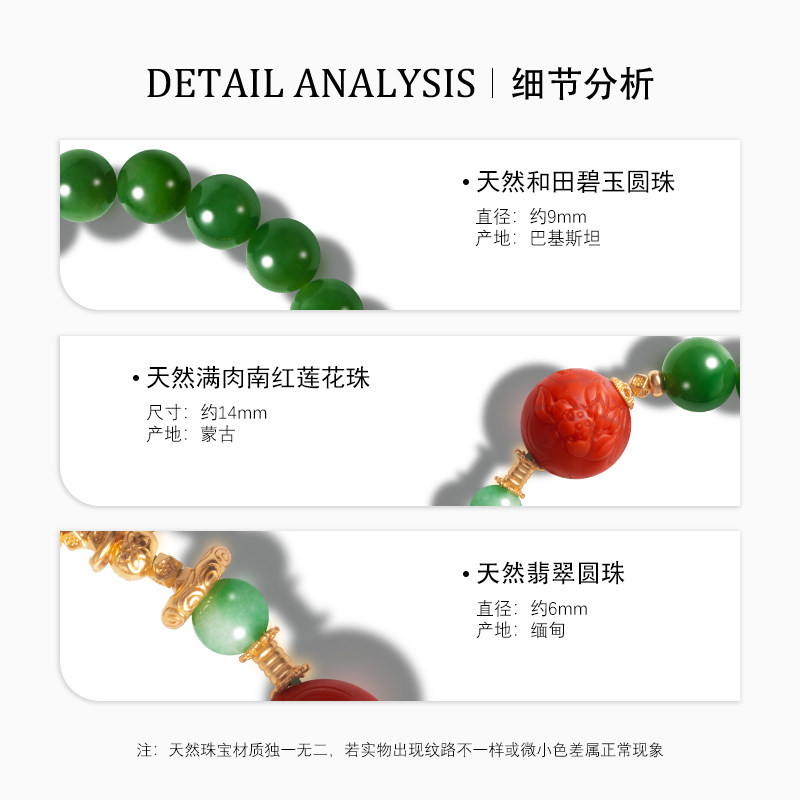 LEFTGO左戈天然和田碧玉手串女款纯银镀18K金南红翡翠9mm圆珠手链