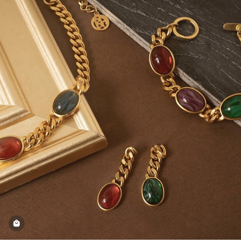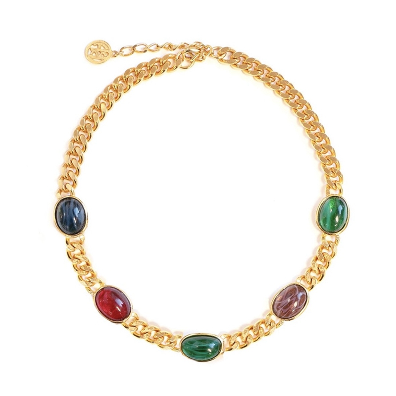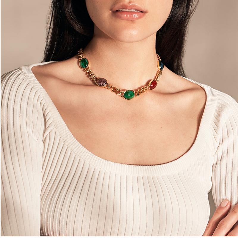 yuwelry法式小众中古轻奢复古镀金多色彩宝琉璃短款项链耳环耳钉