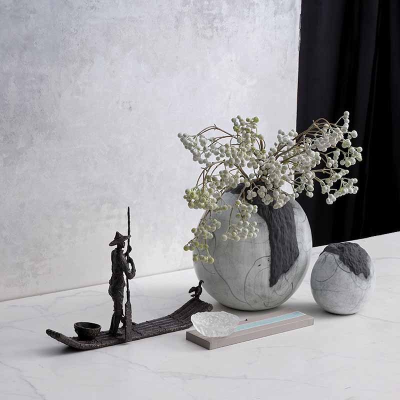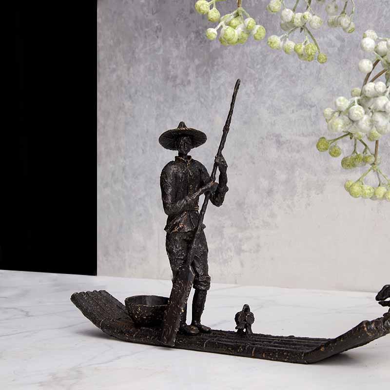 现代轻奢新中式陶罐花器客厅办公室桌面装饰纯铜渔夫人物雕塑摆件