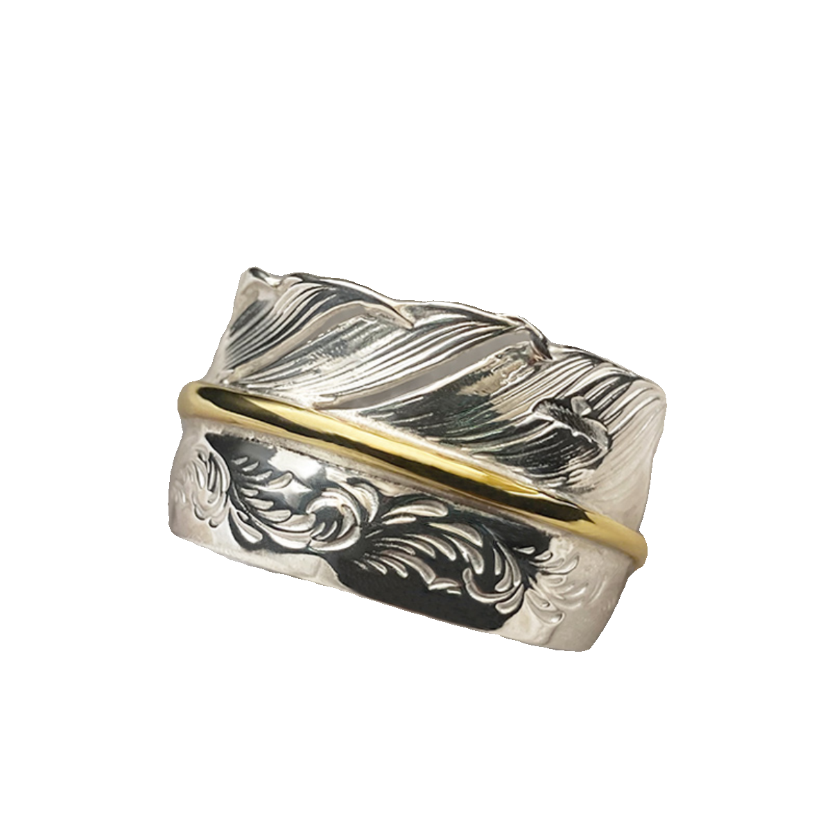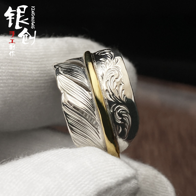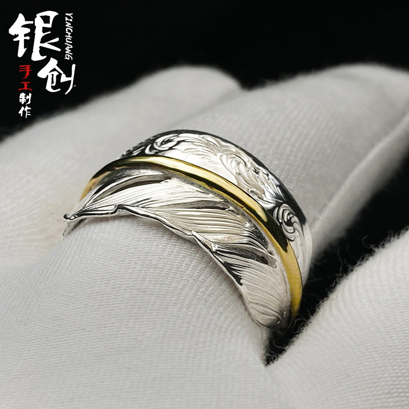 银创鹫见太郎18k金骨唐草羽毛戒指925纯银手工定制潮流复古尾戒男