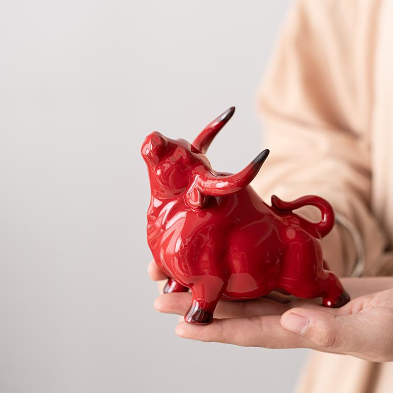 创意陶瓷红色牛摆件家居客厅招财装饰品吉祥物生肖牛年礼品摆设