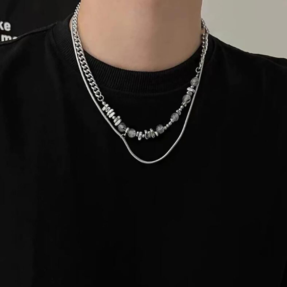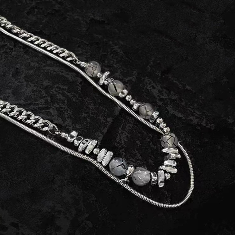 双层天然石钛钢链条拼接项链中性冷淡风双层串珠锁骨链男女款