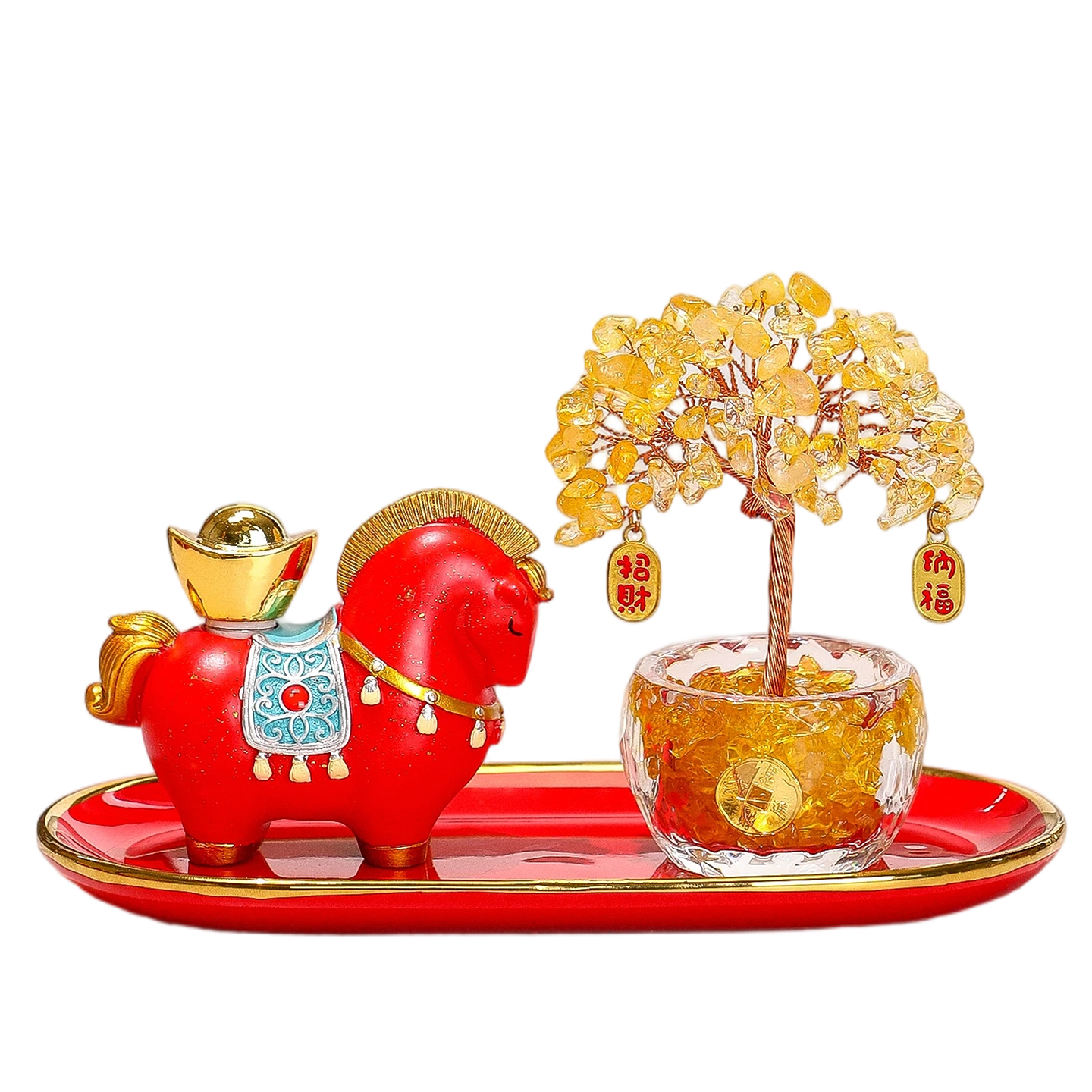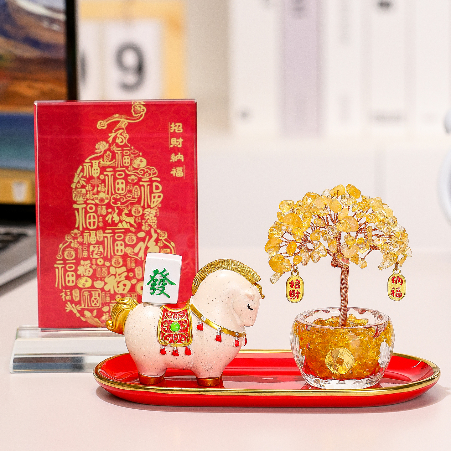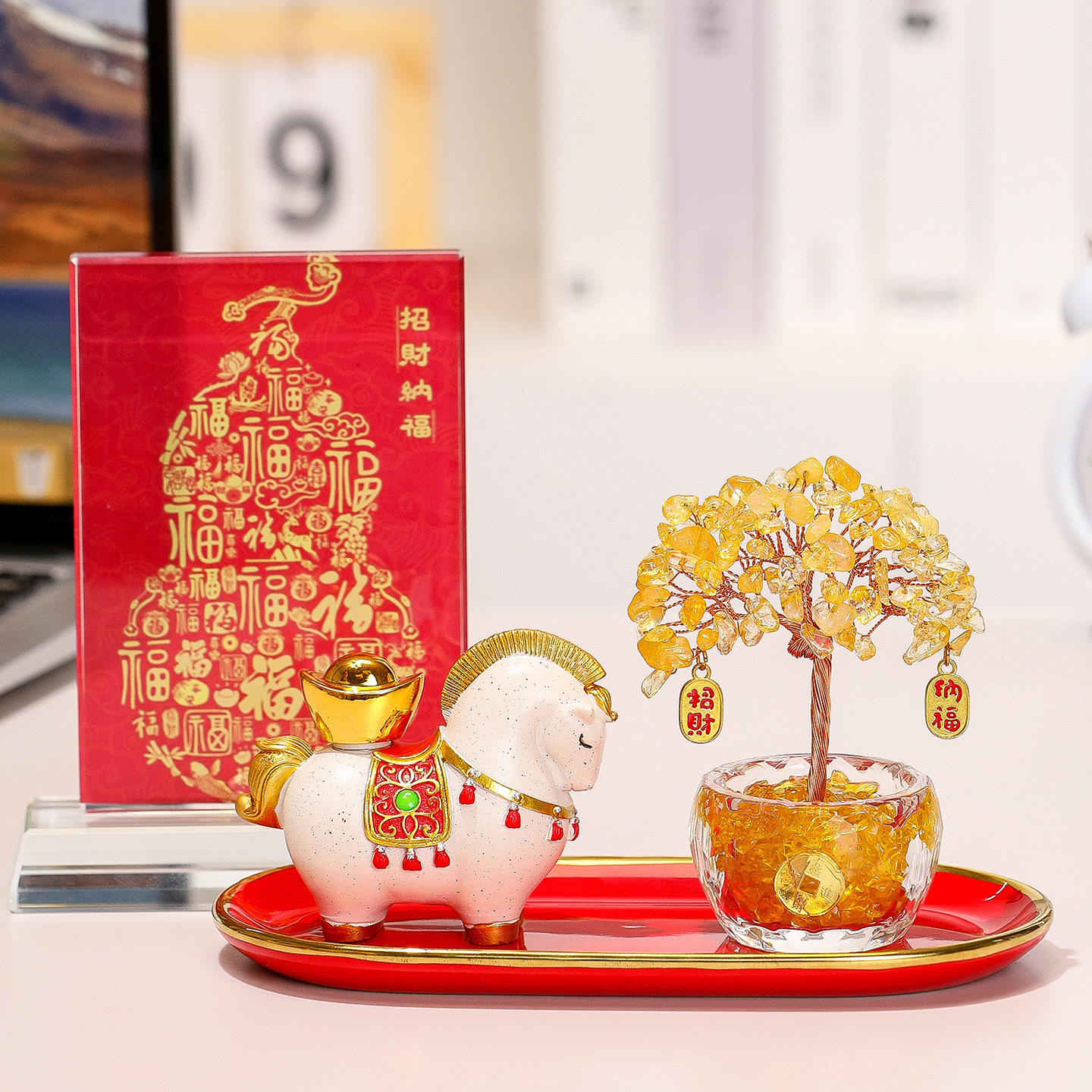 国潮马陶瓷托盘发财树红色吉祥摆件家居装饰品乔迁新居结婚小礼物