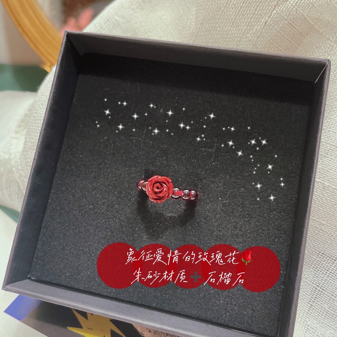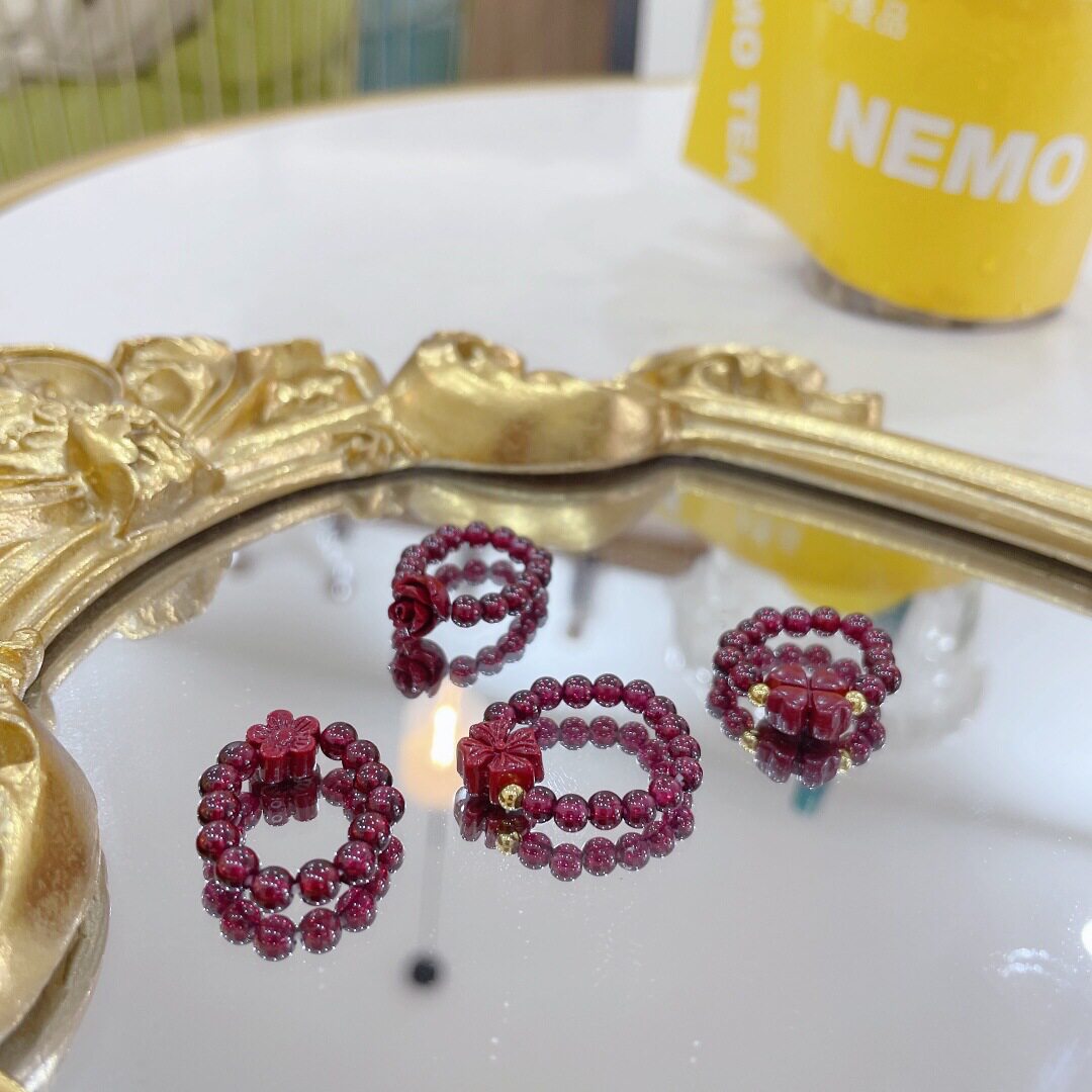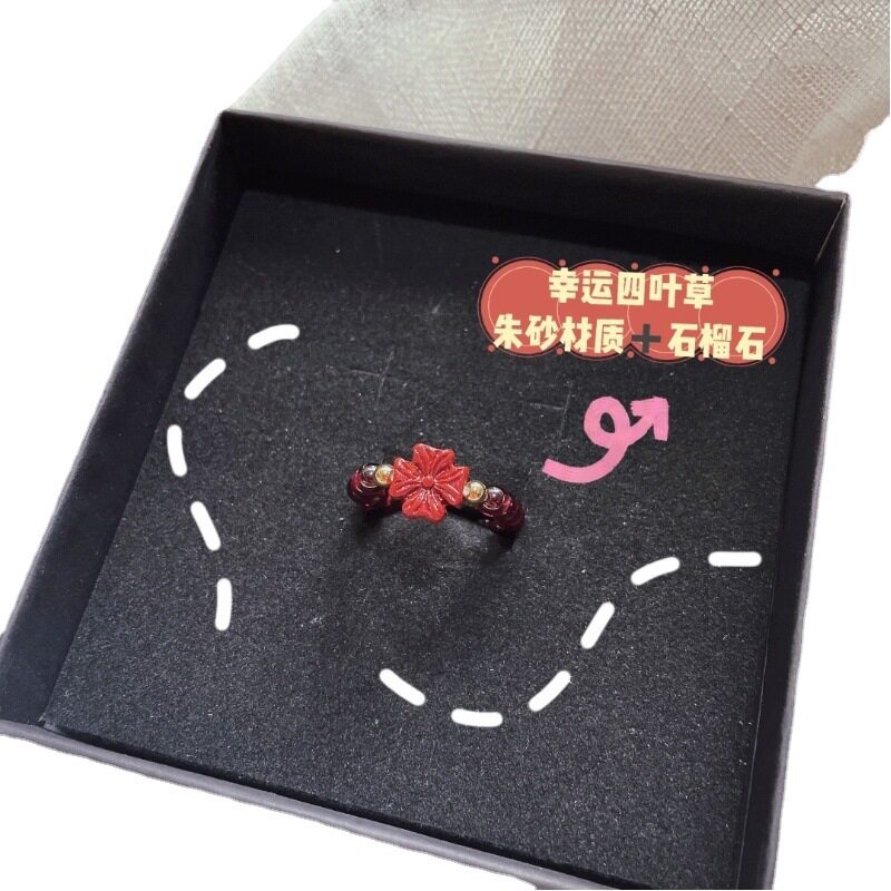 手饰品朱砂小红花石榴石戒指女四叶草玫瑰花红色石榴石水晶手之环