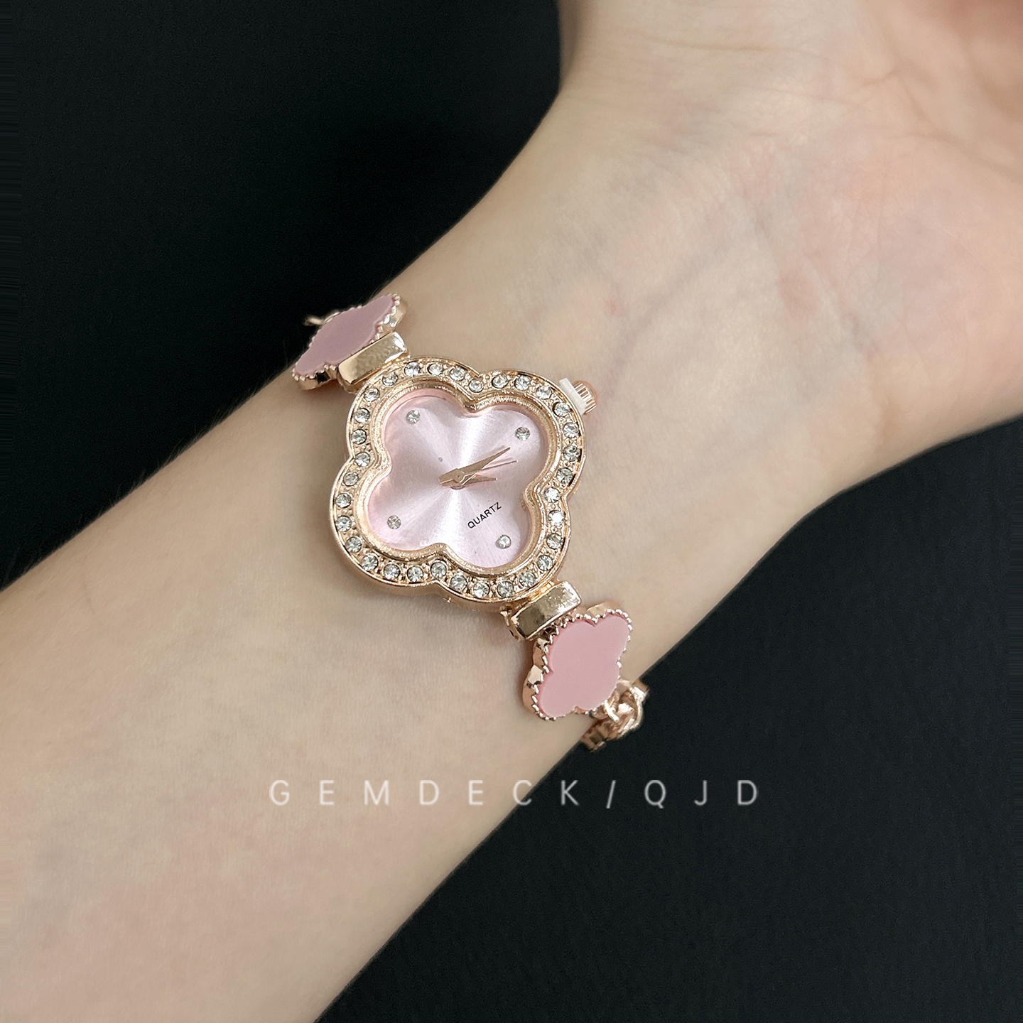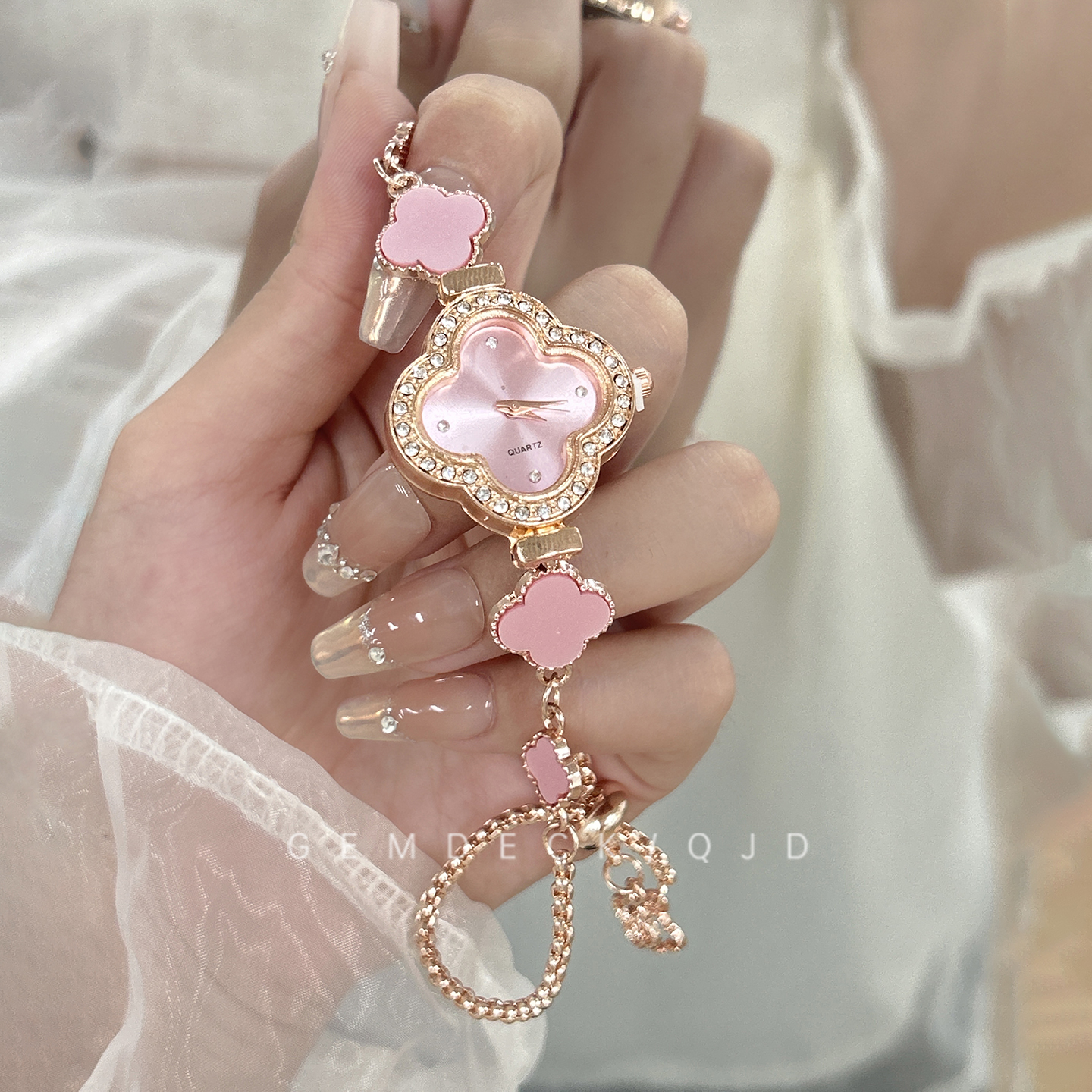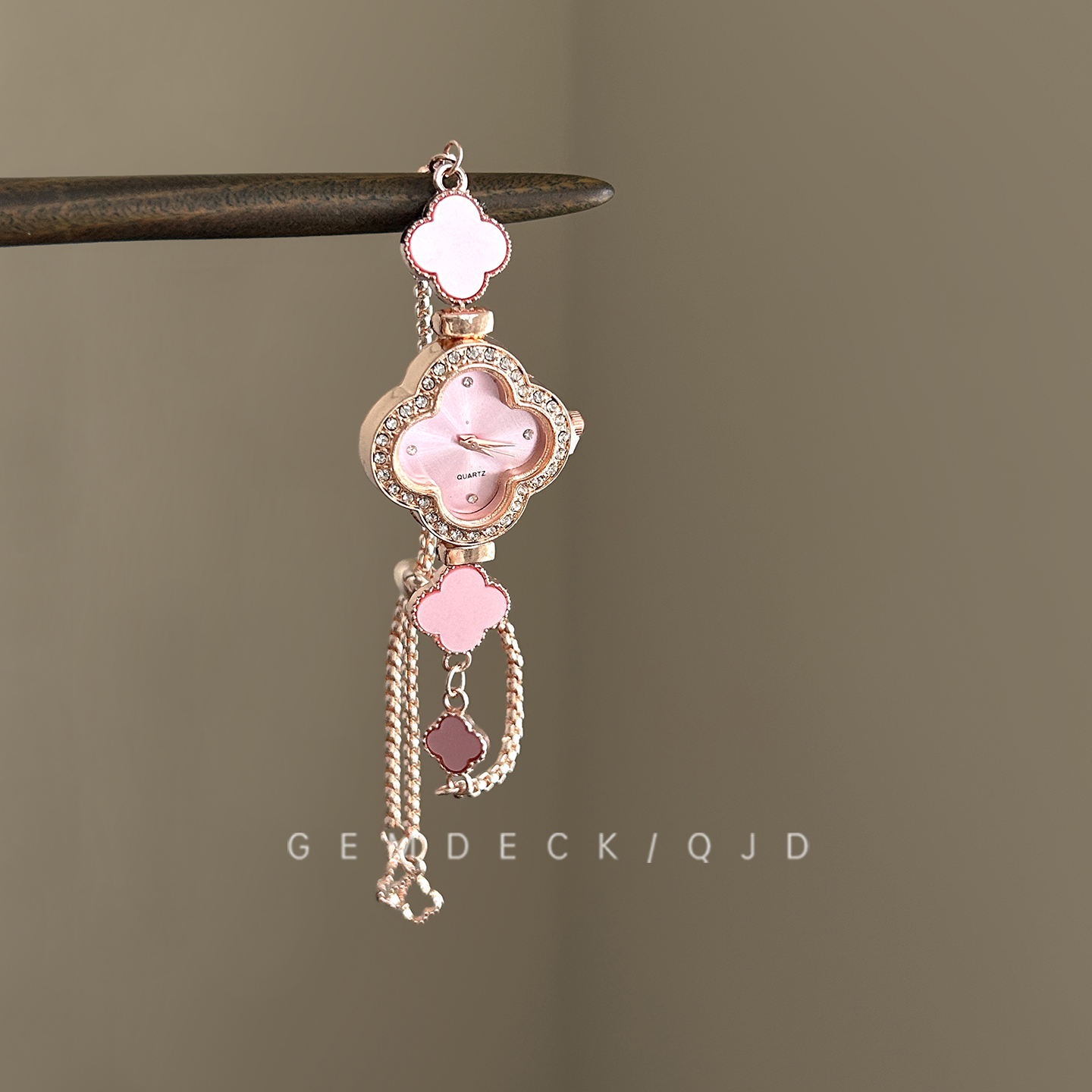 Vintage古着粉色四叶草手表法式高级感气质手链可伸缩调节腕表女