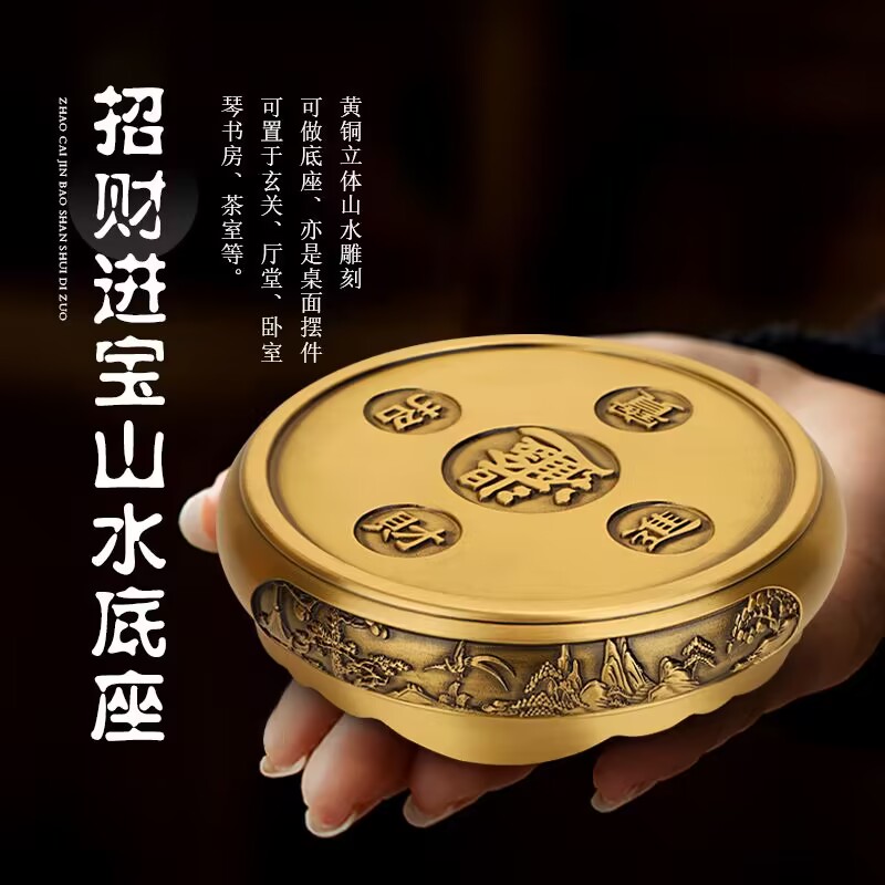 黄铜铜缸山水底座摆件招财进宝款摆放聚宝盆香炉金属座架复古怀旧