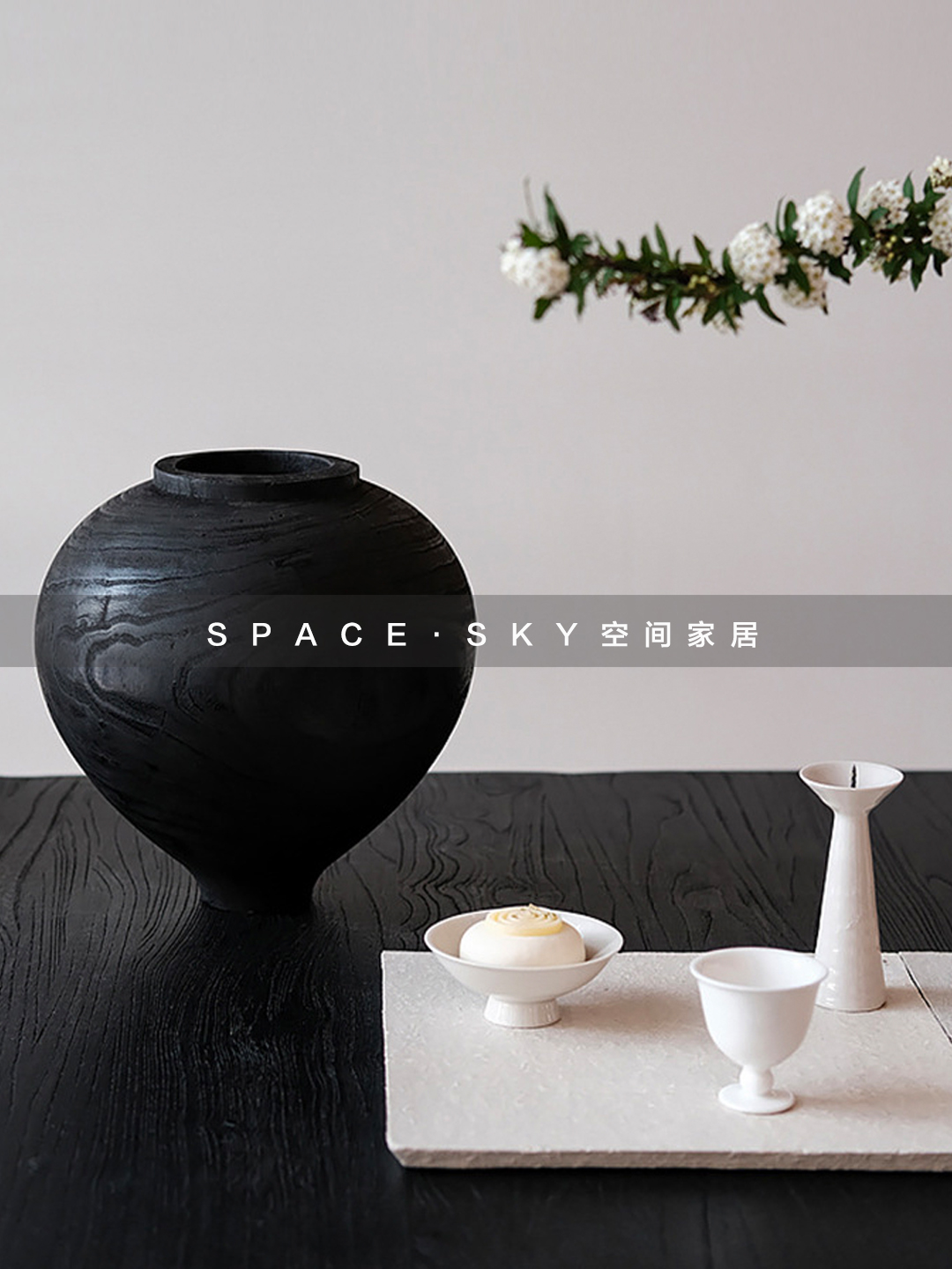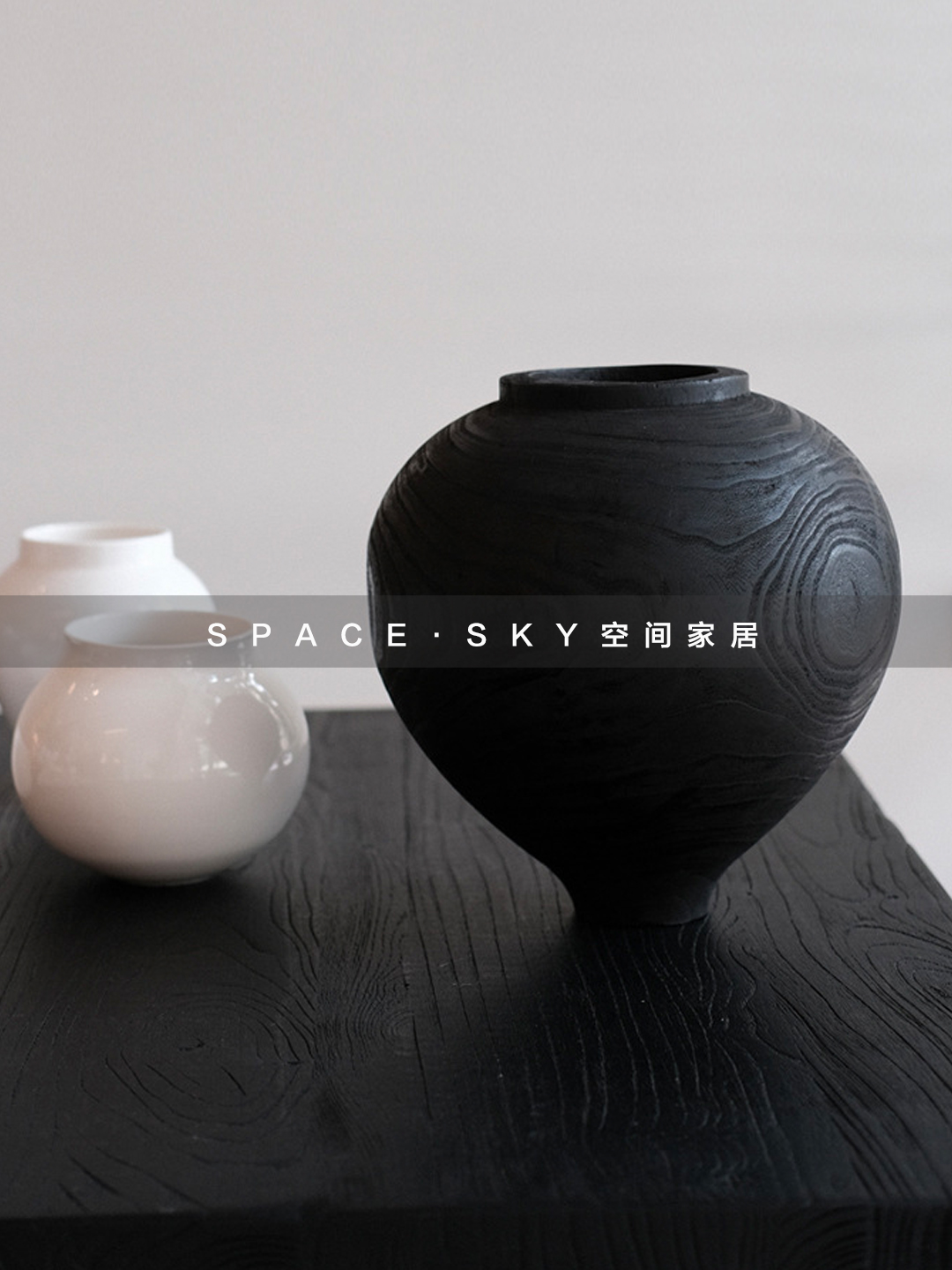 中式样板间碳化木黑色花瓶家居别墅艺术装饰摆件创意几何圆形托盘