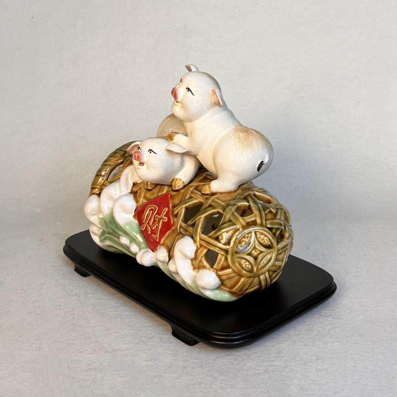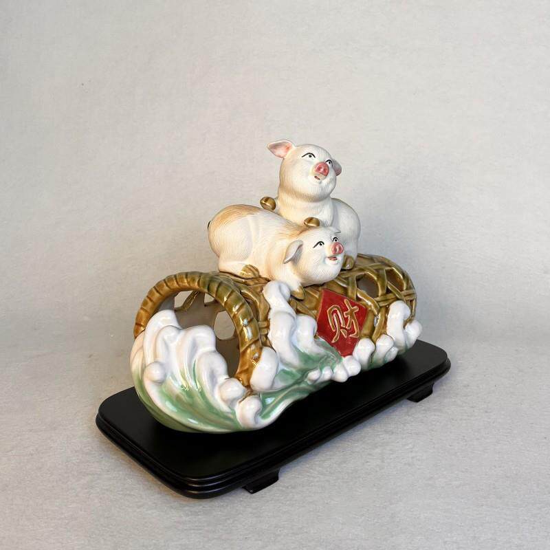 猪笼入水俩个小猪陶瓷摆件石湾公仔