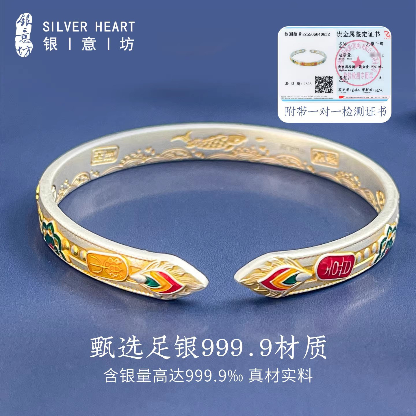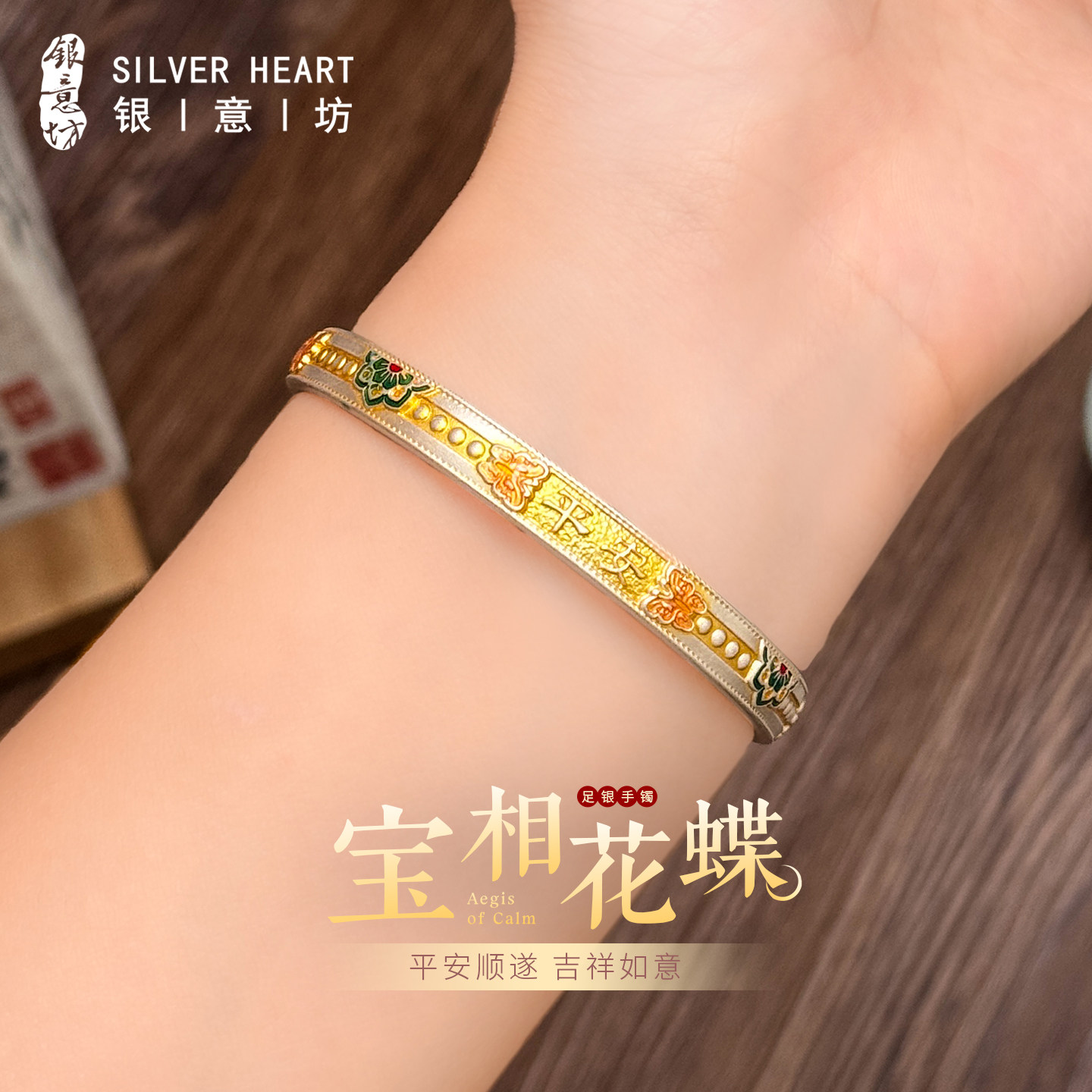 银意坊珐琅手镯女开口9999纯银实心银镯子年轻款新中式国风银首饰