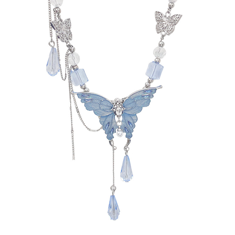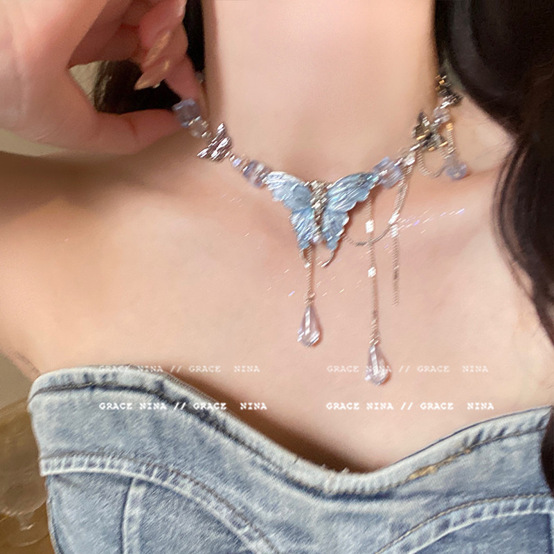 正向共振!重工蓝色水晶蝴蝶项链女款2025新款小众轻奢锁骨链配饰