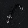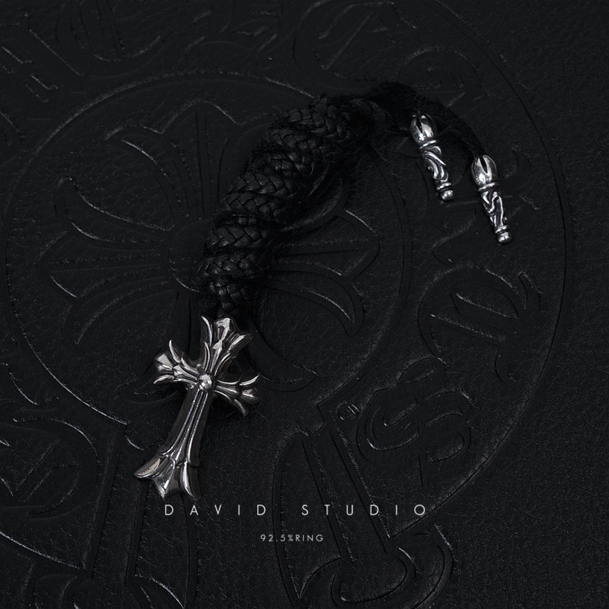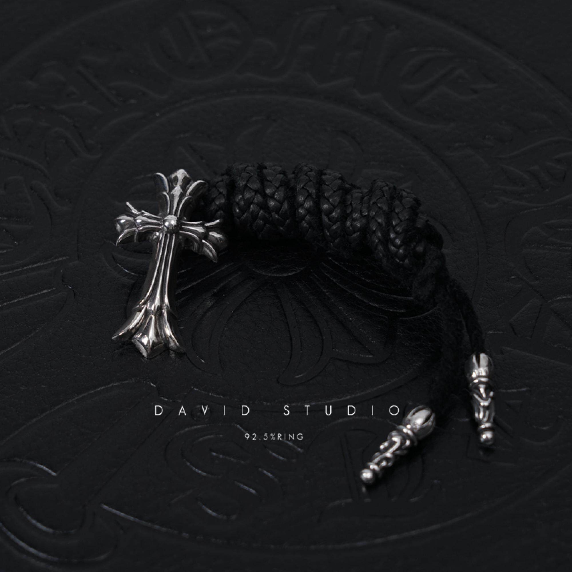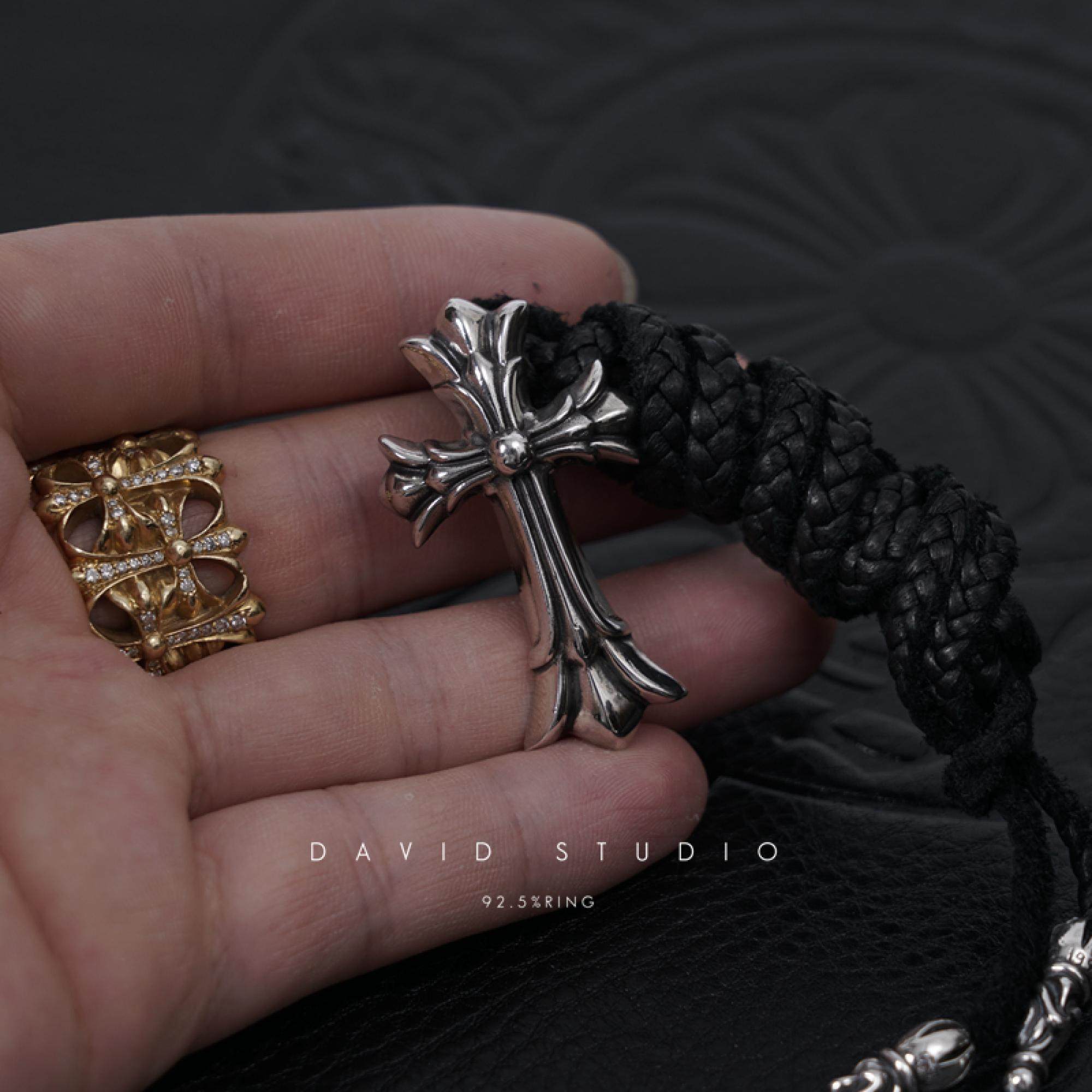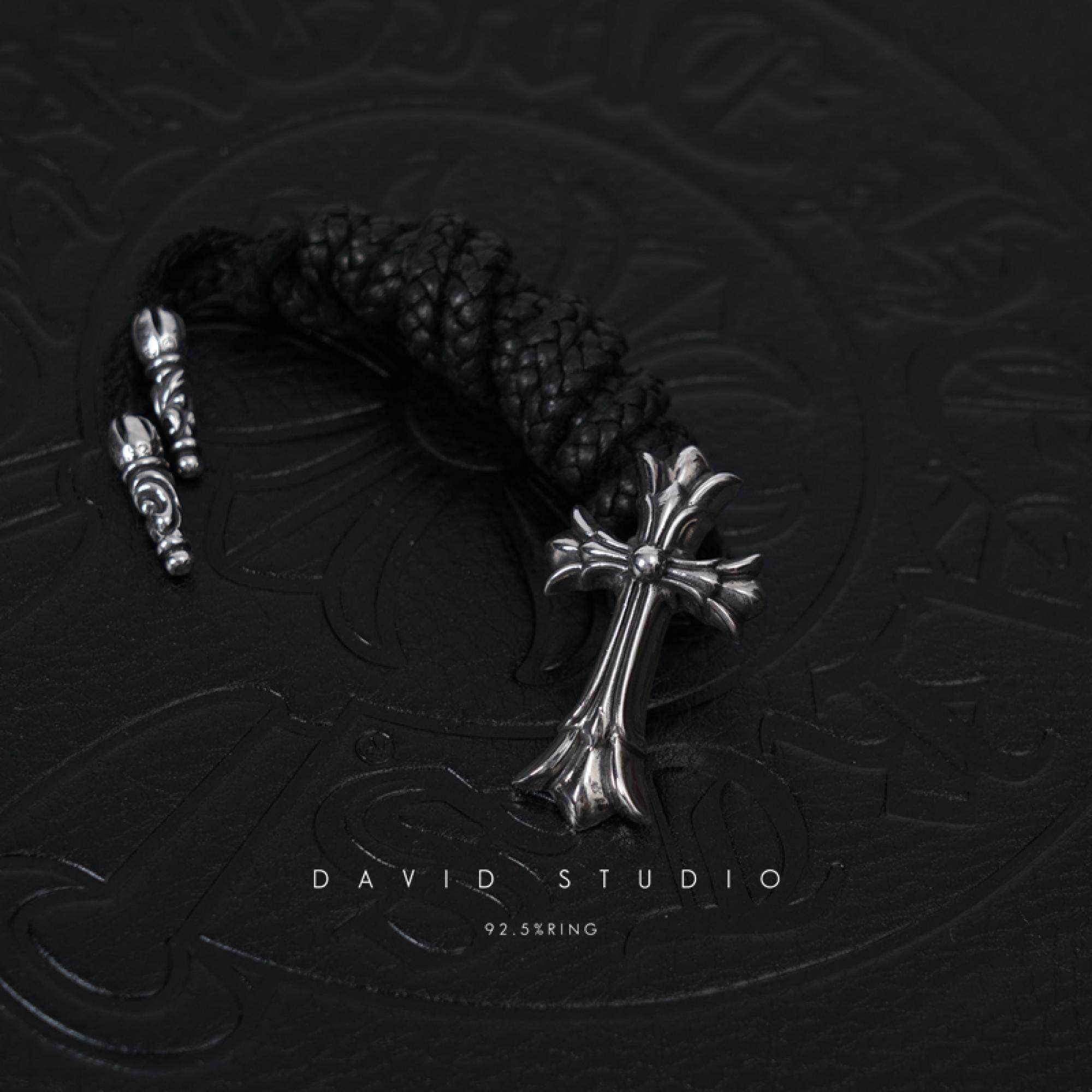 David studio925纯银双层十字架吊坠井口牛皮绳链机车情侣款项链