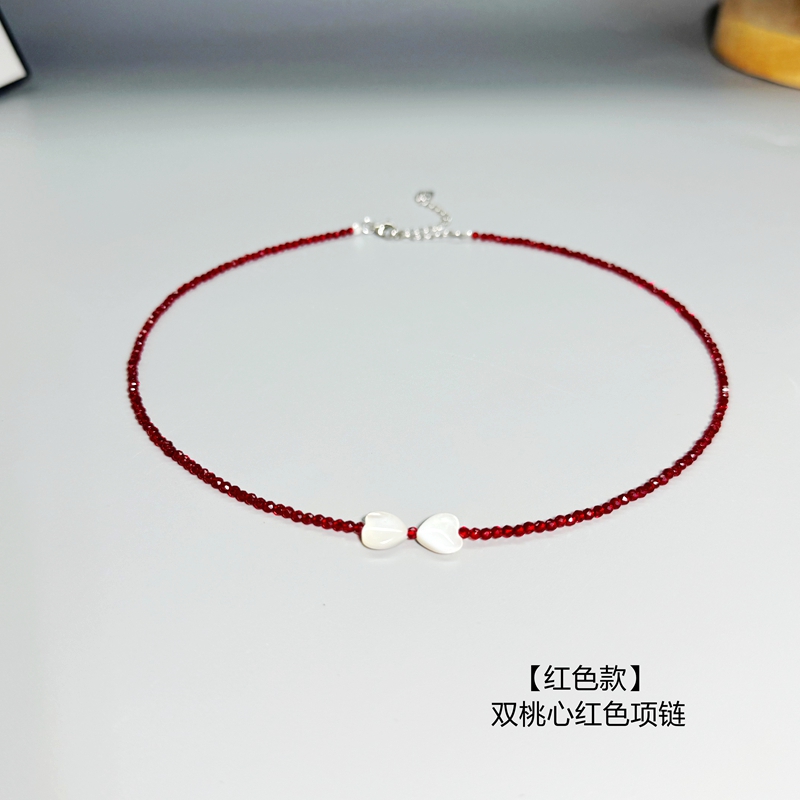 S925纯银高级桃心蝴蝶结黑色红色尖晶石串珠项链女锁骨链小众设计