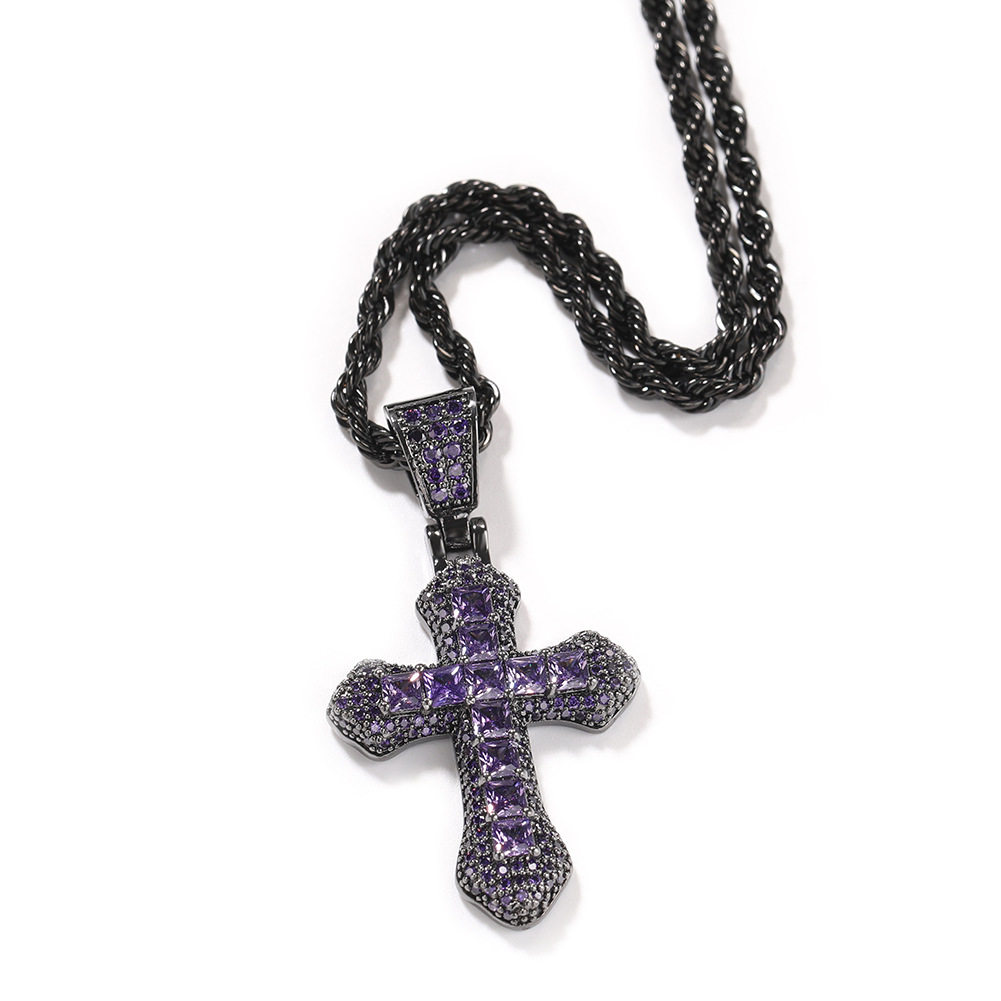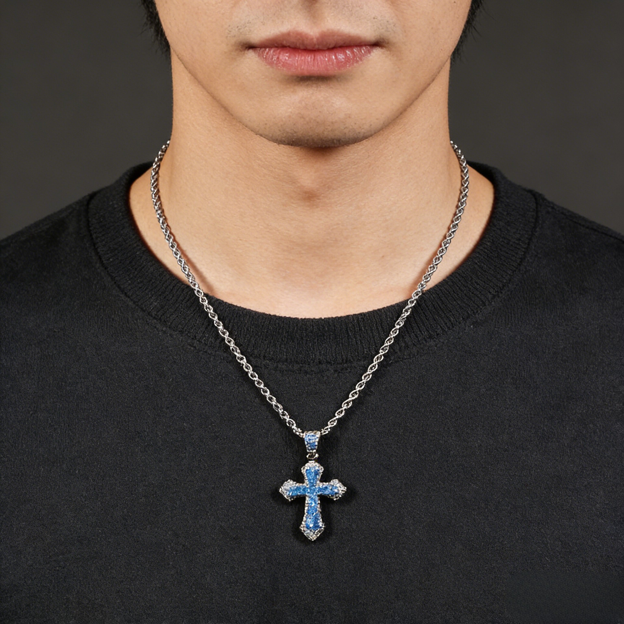 蓝色锆石十字架男款项链时尚百搭重工朋克毛衣链饰品高级小众潮流