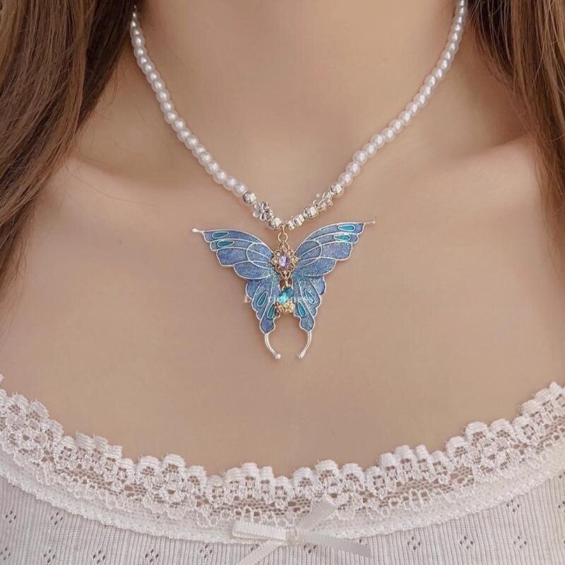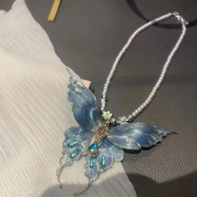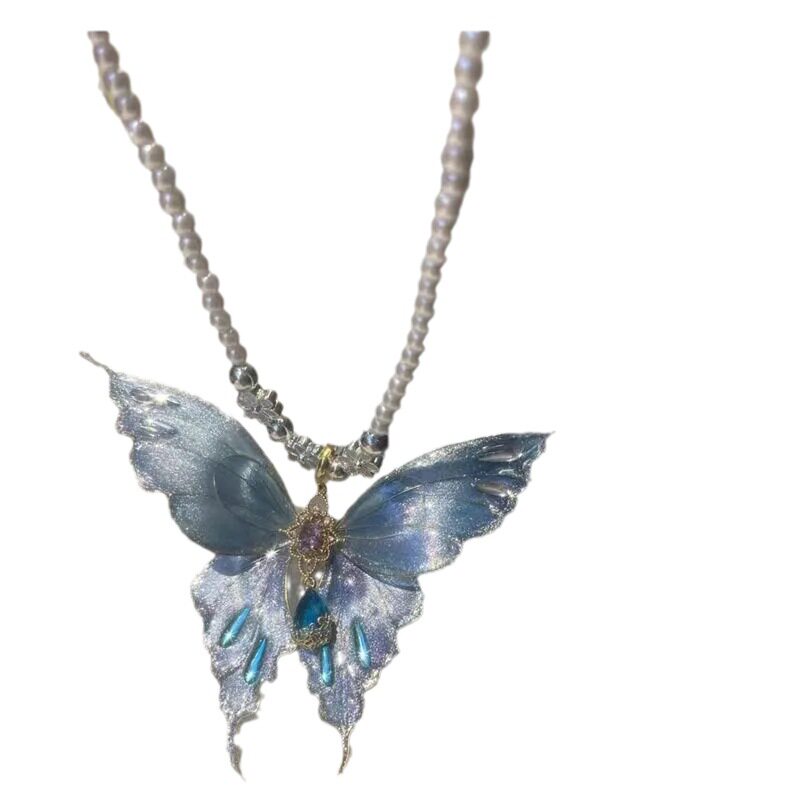 晴山蝴蝶 2023年新款温柔治愈系高档珍珠幻彩蓝色吊坠蝴蝶项链