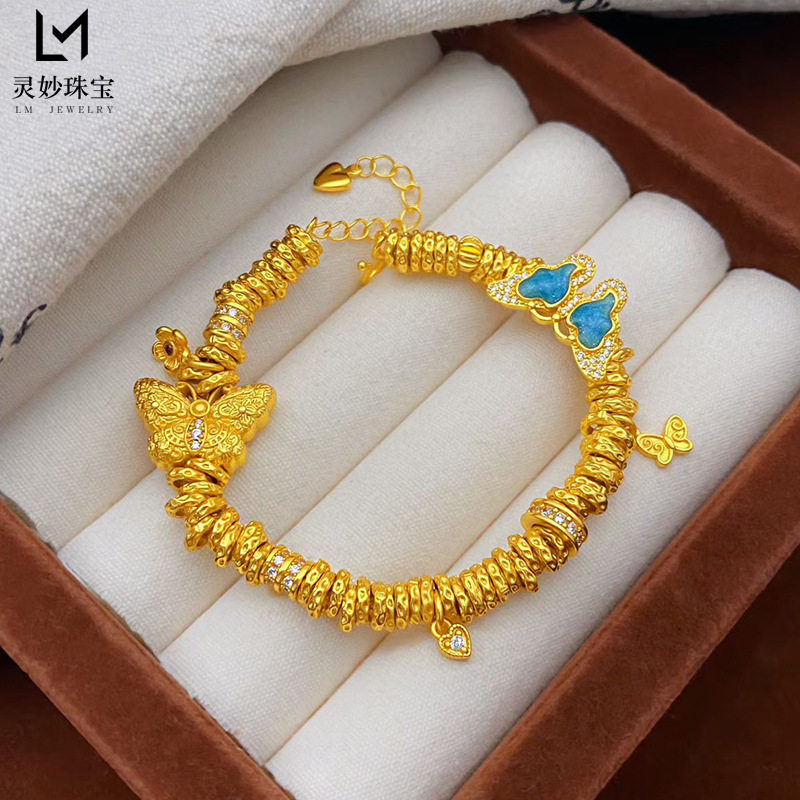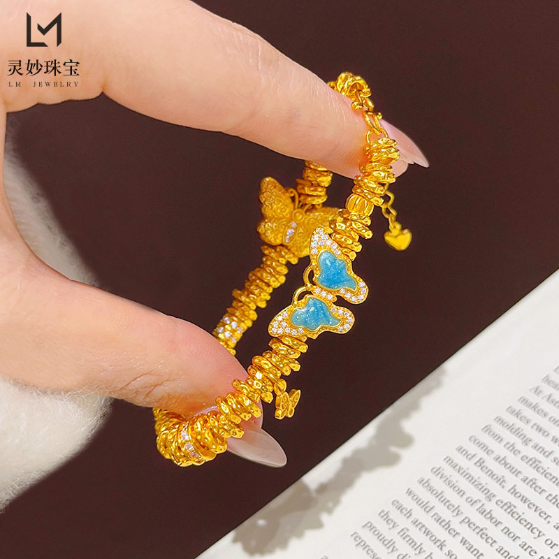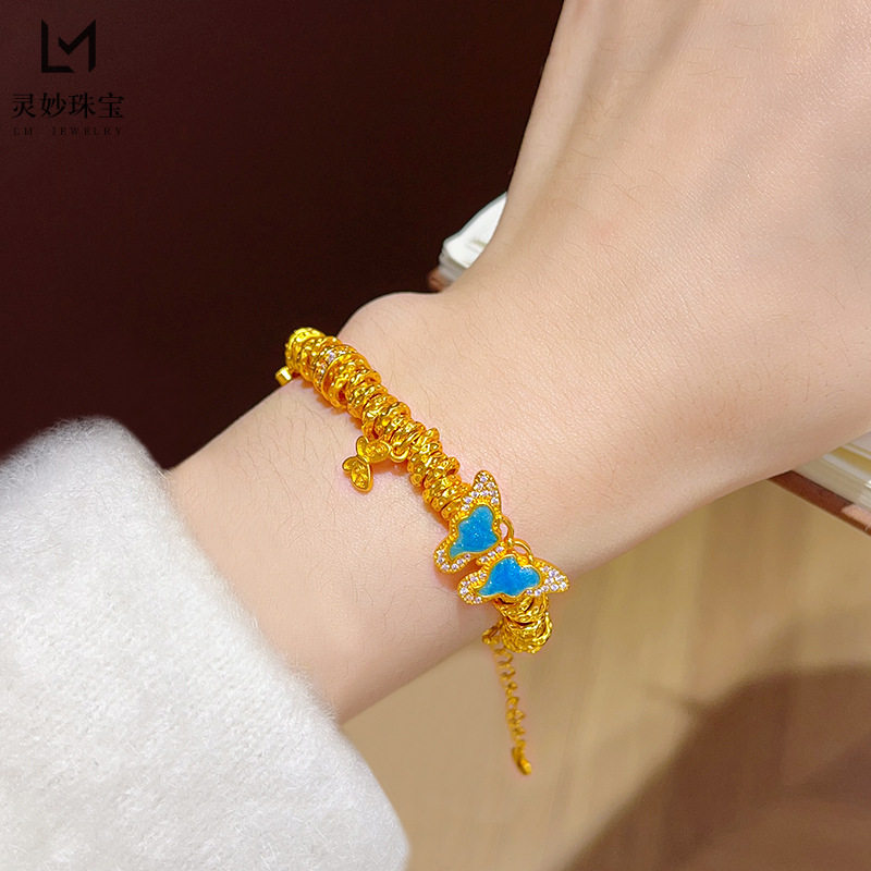 越南沙金999点钻蓝色鎏彩双蝶盘缠手链錾刻福蝶设计款手串国风女