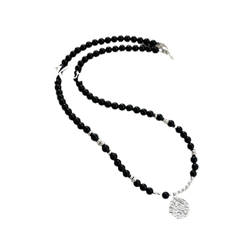 日系韩版手工饰品 s925纯银肌理感圆牌黑玛瑙项链简约叠戴ins
