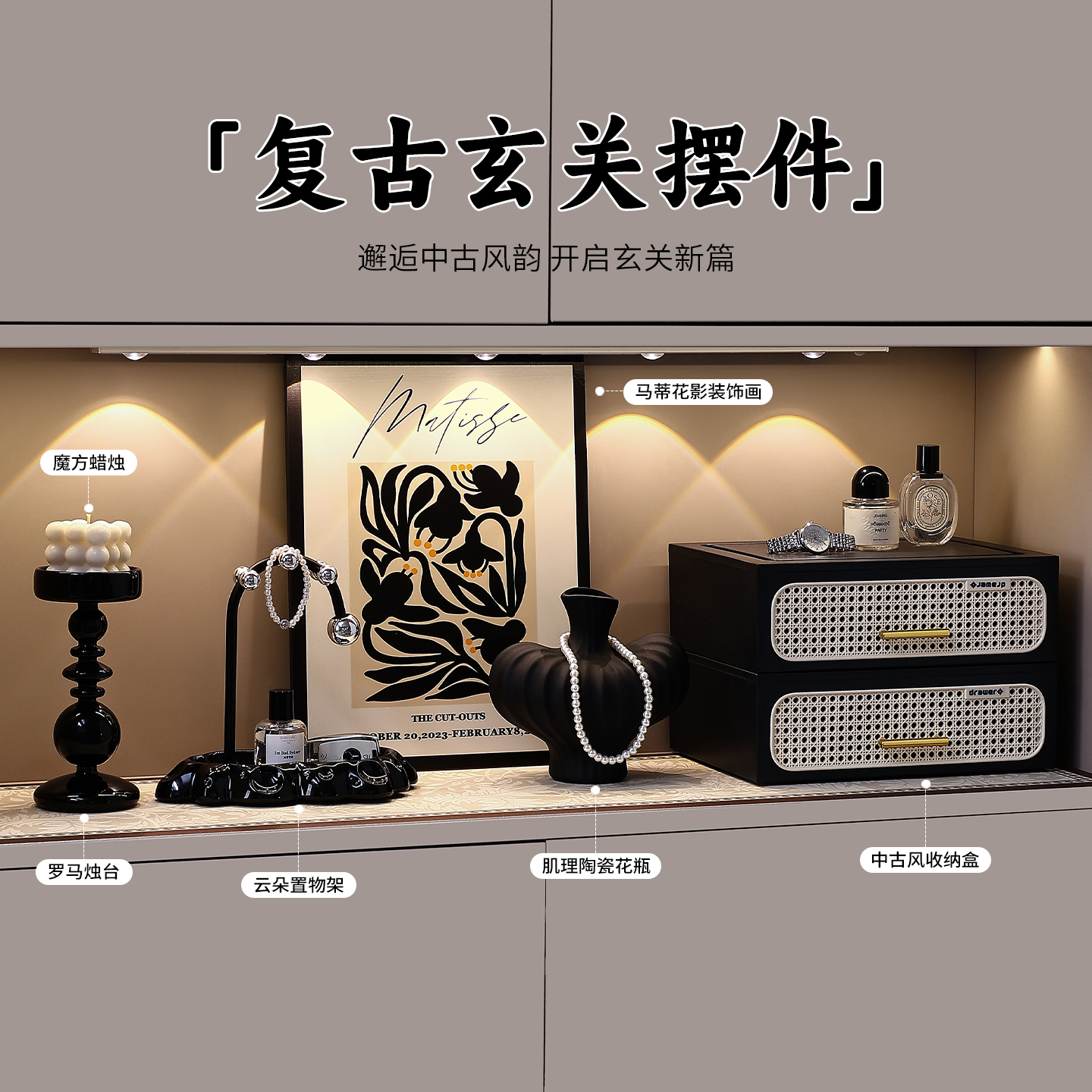 中古风玄关摆件进门口法式装饰新中式摆画放钥匙收纳复古软装鞋柜