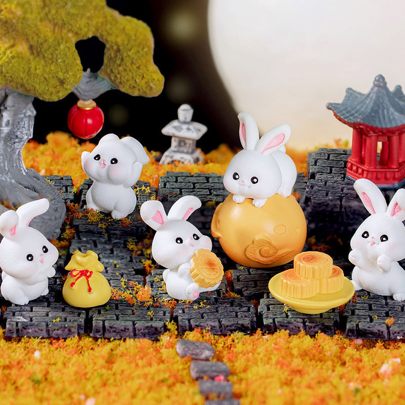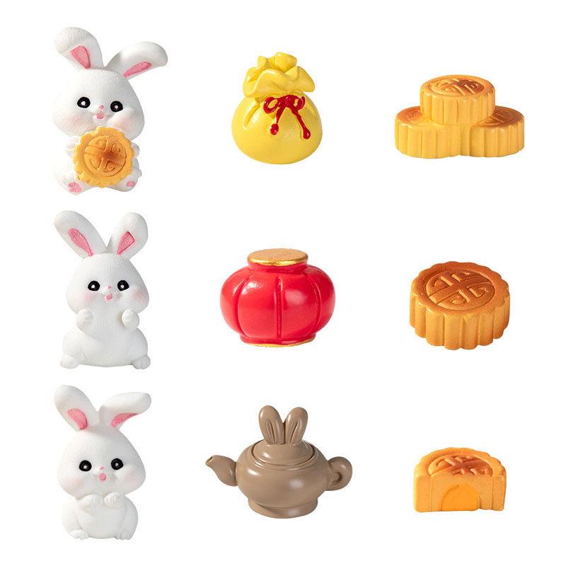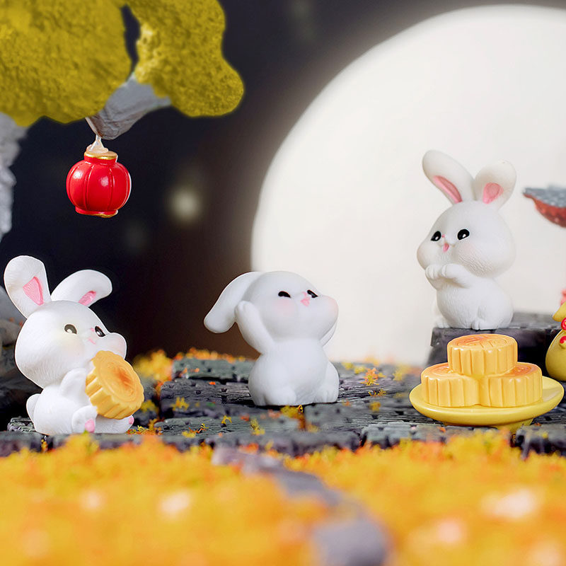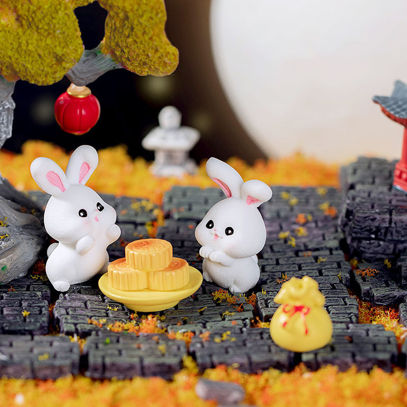 微景观兔子摆件中秋可爱树脂小动物创意手工月饼茶壶灯笼蛋糕摆设