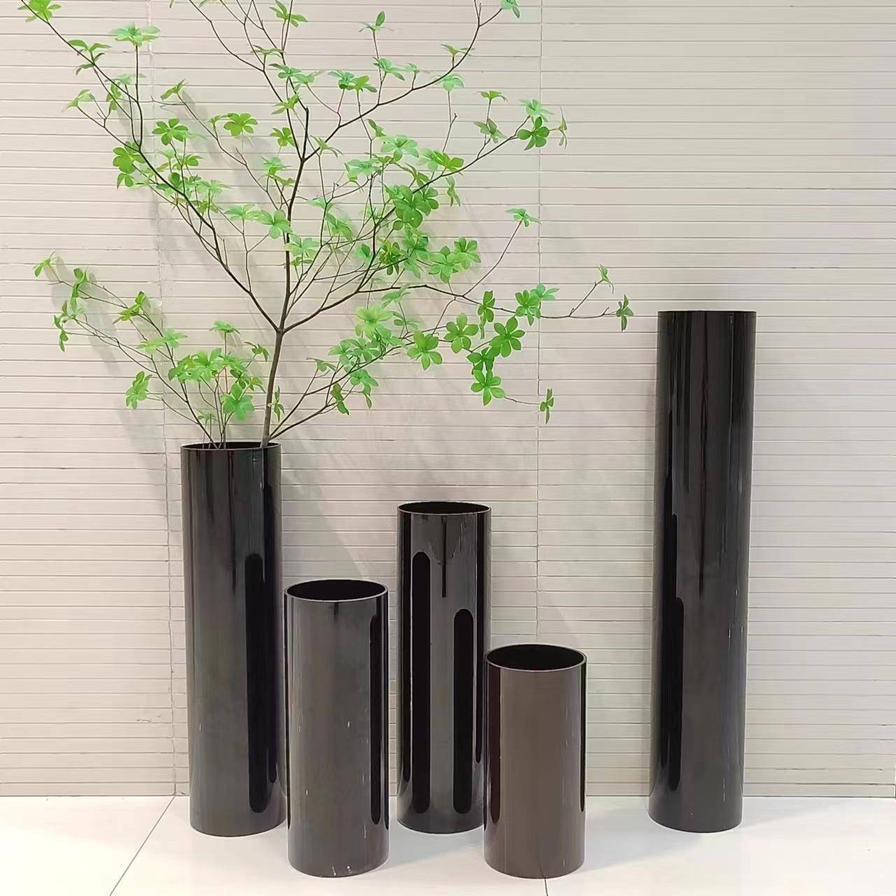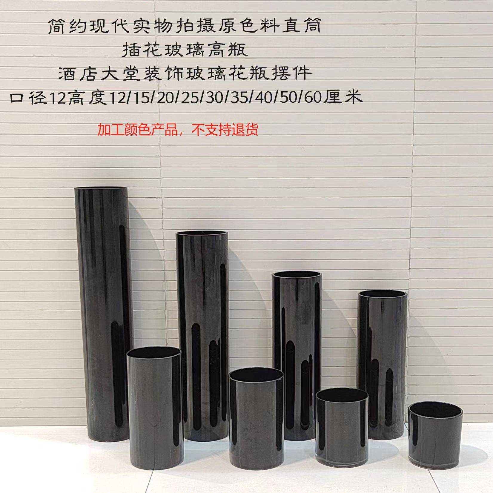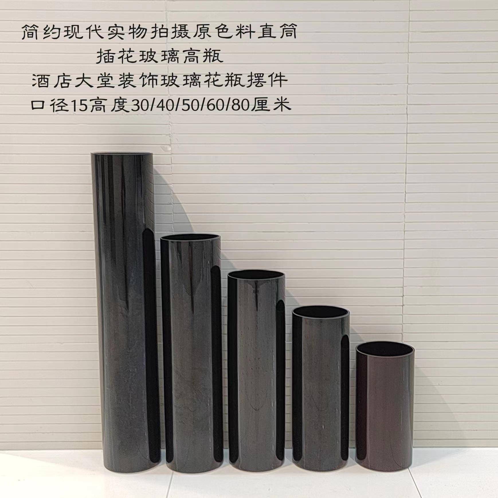 简约现代实物拍摄喷黑色直筒插花玻璃高瓶酒店大堂装饰玻璃花瓶摆