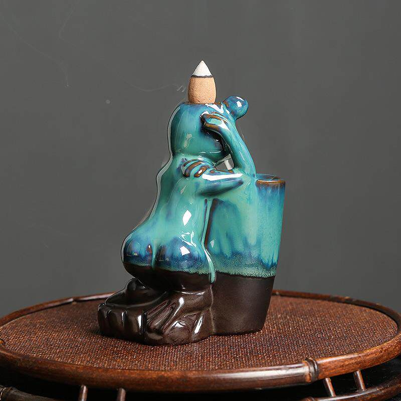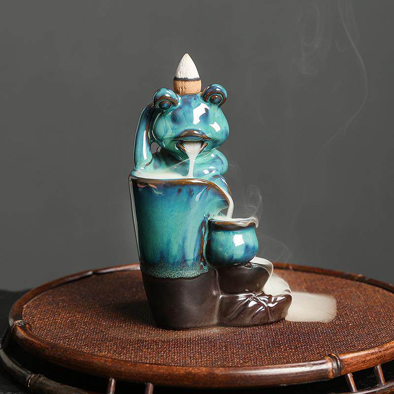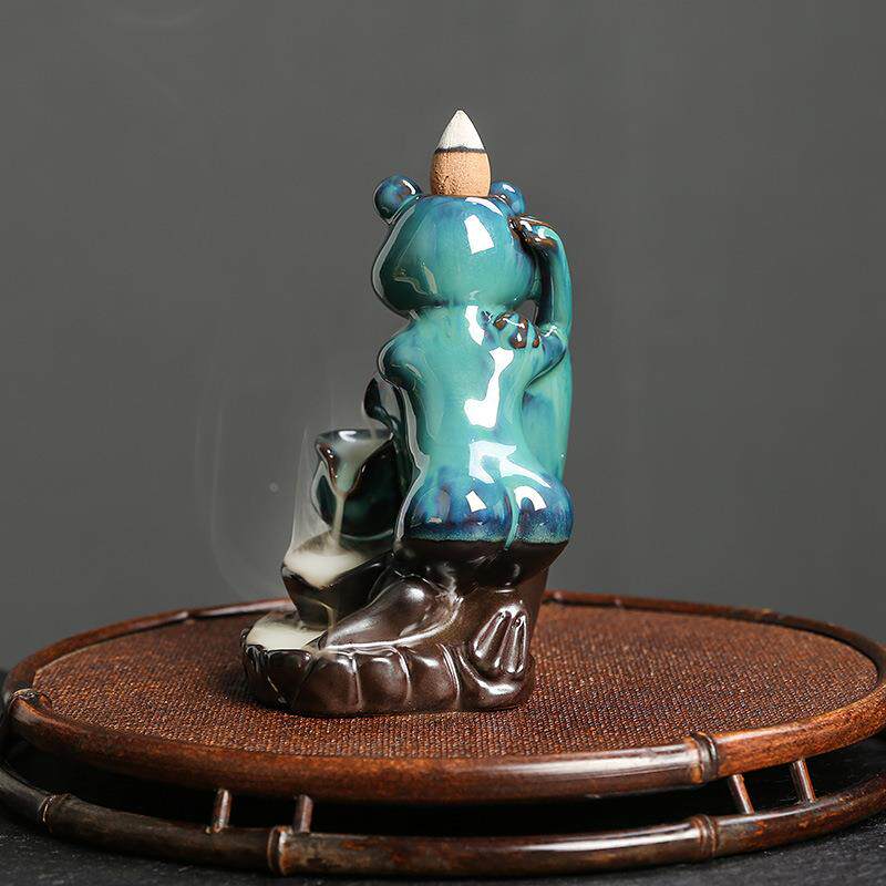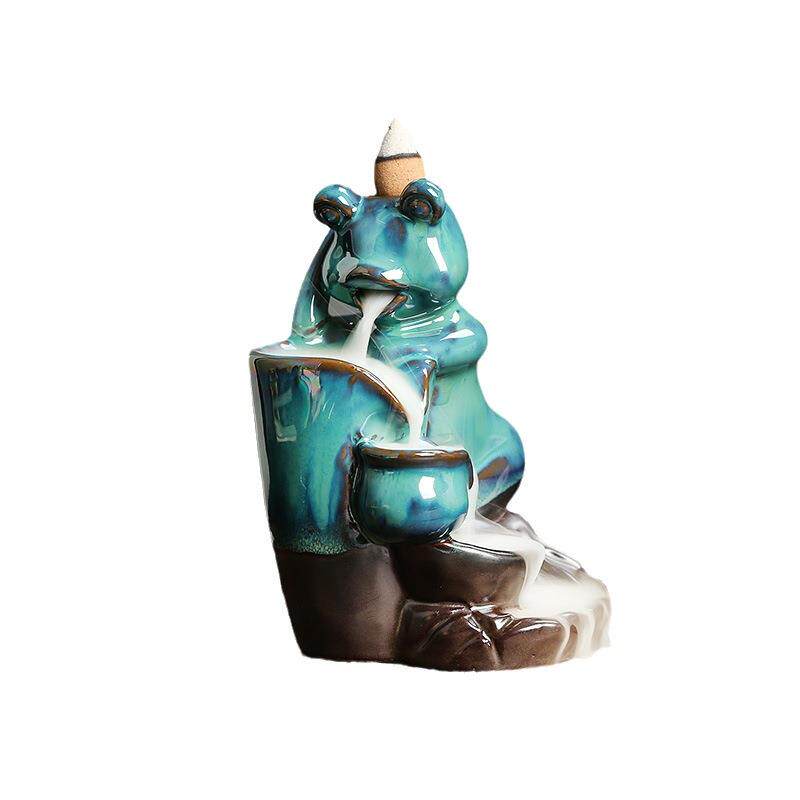跨境陶瓷倒流檀香香薰炉 创意窑变釉蓝色青蛙倒流香香炉家居摆件