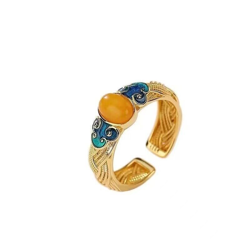 新款蓝色祥云蜜蜡镀金戒指男款古法金色复古开口可调节指环戒指