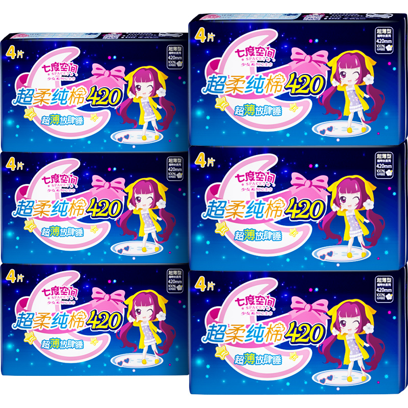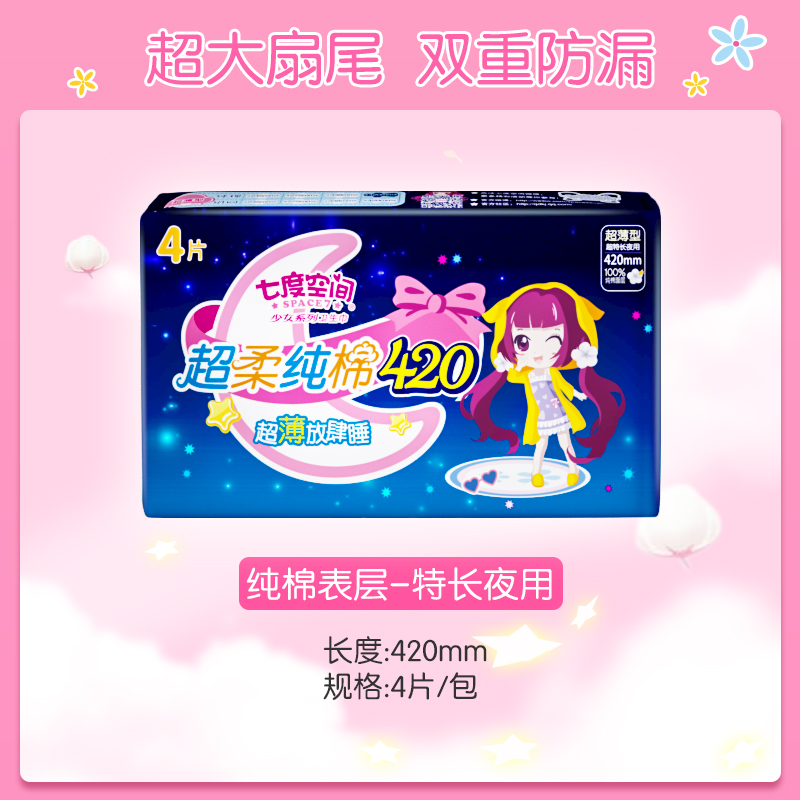 七度空间纯棉卫生巾少女超长夜用420特长薄姨妈巾组合装整箱正品