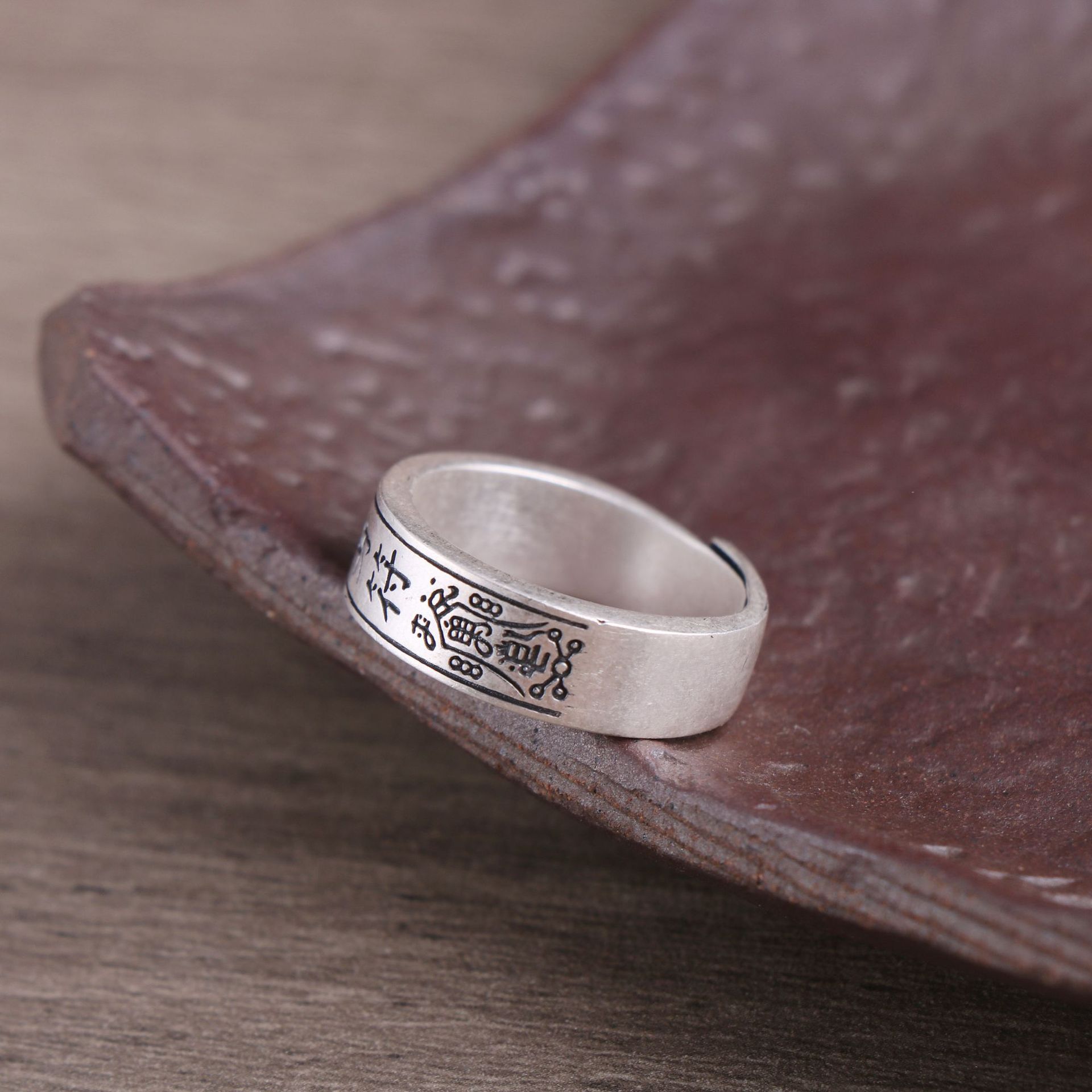 护身符图案纯银戒指 足银999开口宽面男女士佛道平安符文指环批发