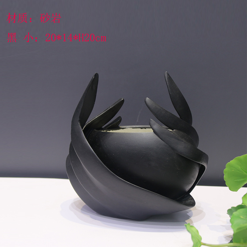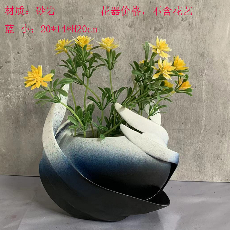 现代简约砂岩抽象黑白蓝羽翼花盆花瓶摆件样板间客厅玄关花器装饰