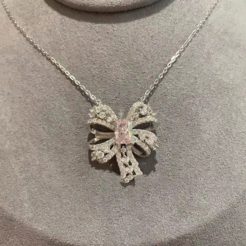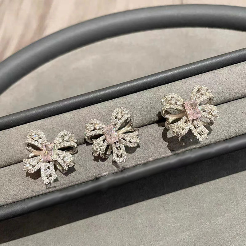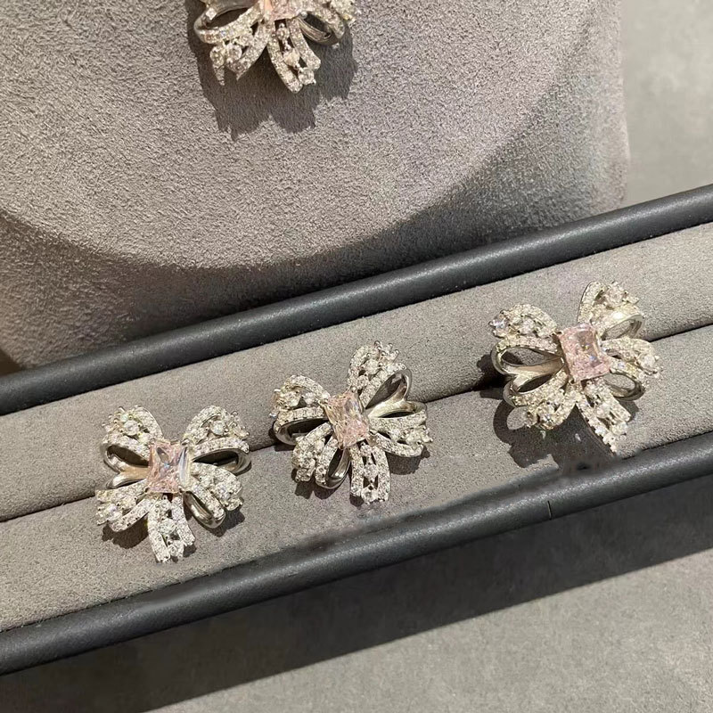 满钻粉锆石蝴蝶结戒指气质百搭耳钉项链女锁骨链新款首饰三件套装