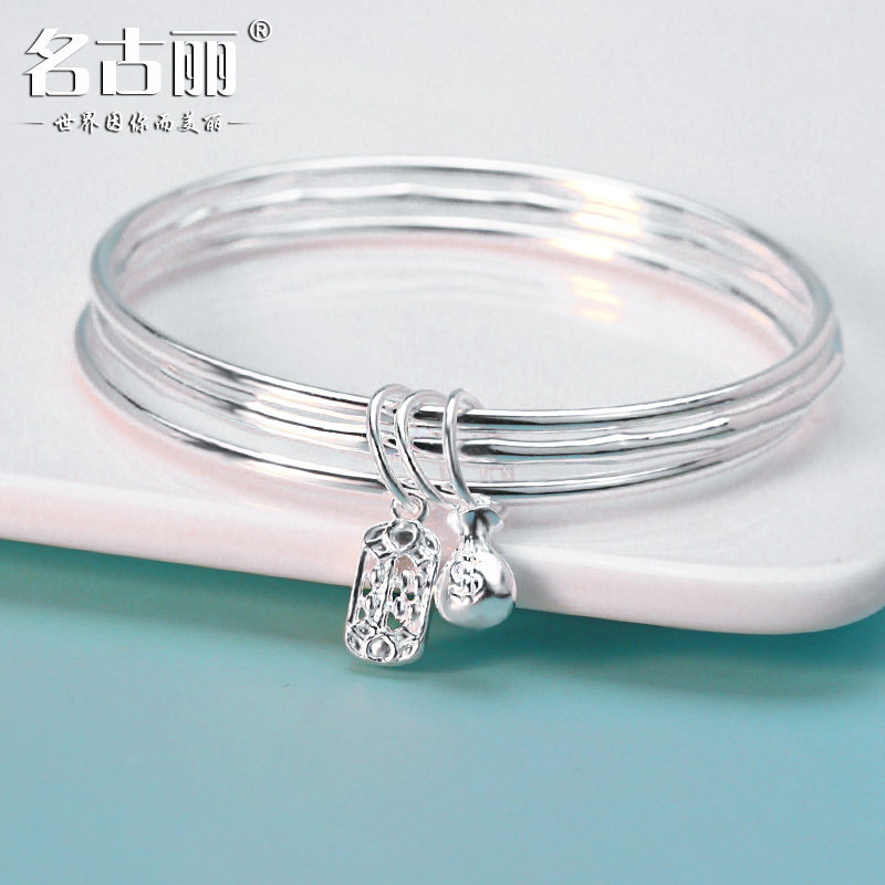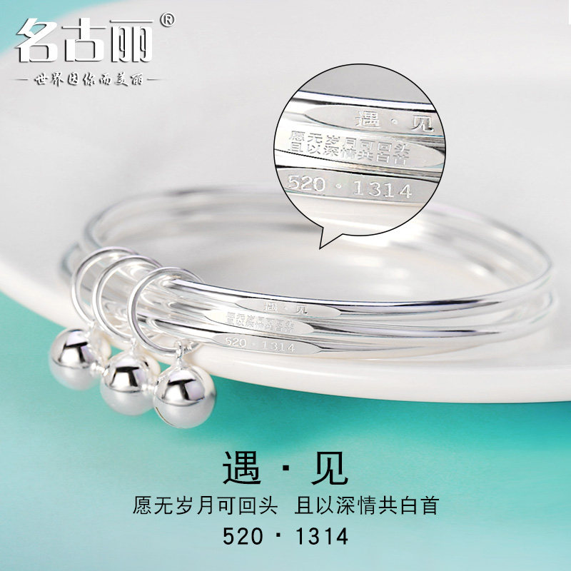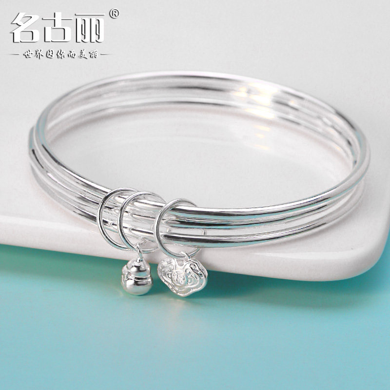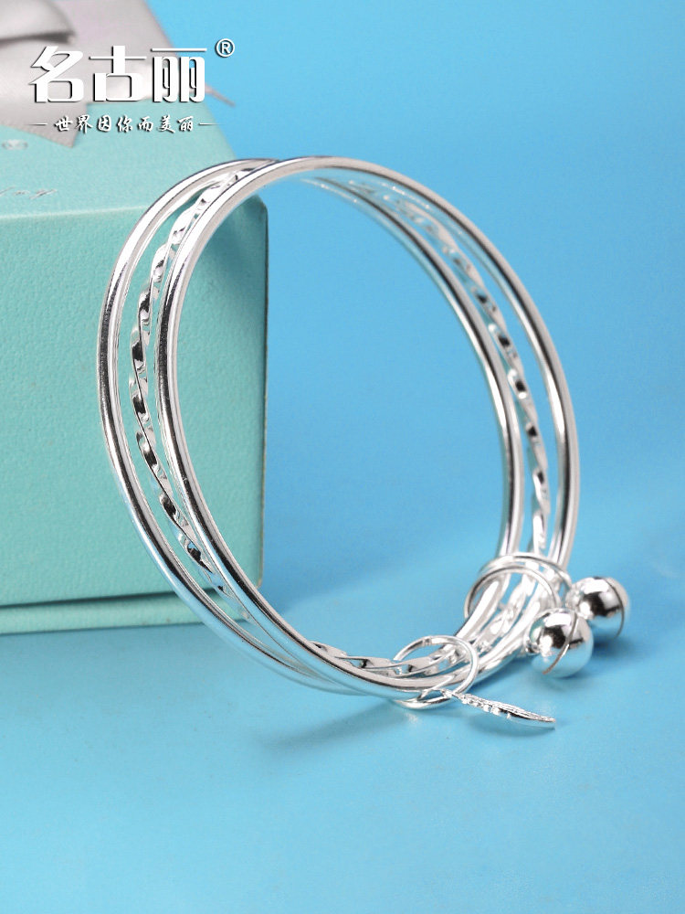 三生三世9999纯银手镯女实心三圈闭口硬套手环年轻款足银镯子铃铛